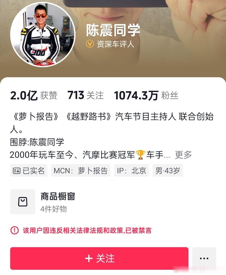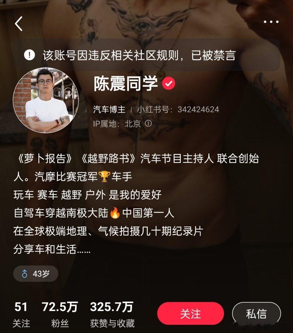 陈震回应被全平台禁言陈震的大号和小号都被禁言了,而且写得很清楚,是因违反相关法律