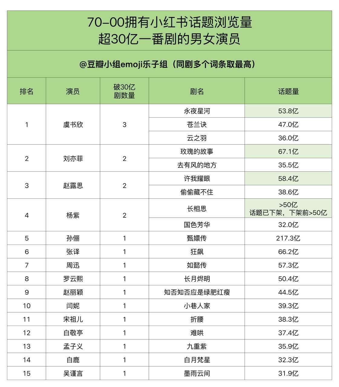 70-00拥有小红书话题浏览量超30亿一番剧的男女演员拉表