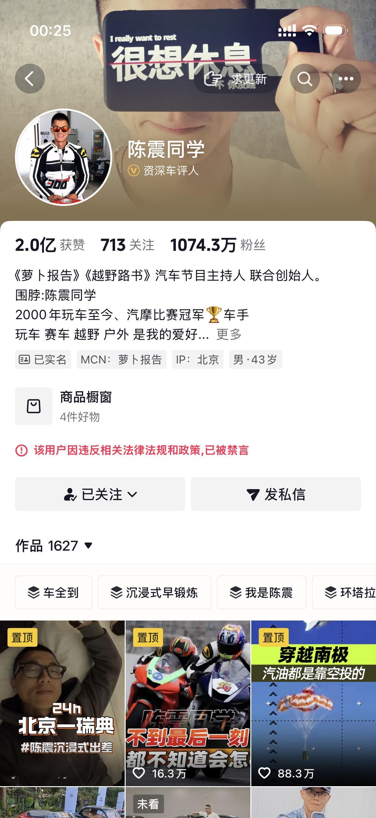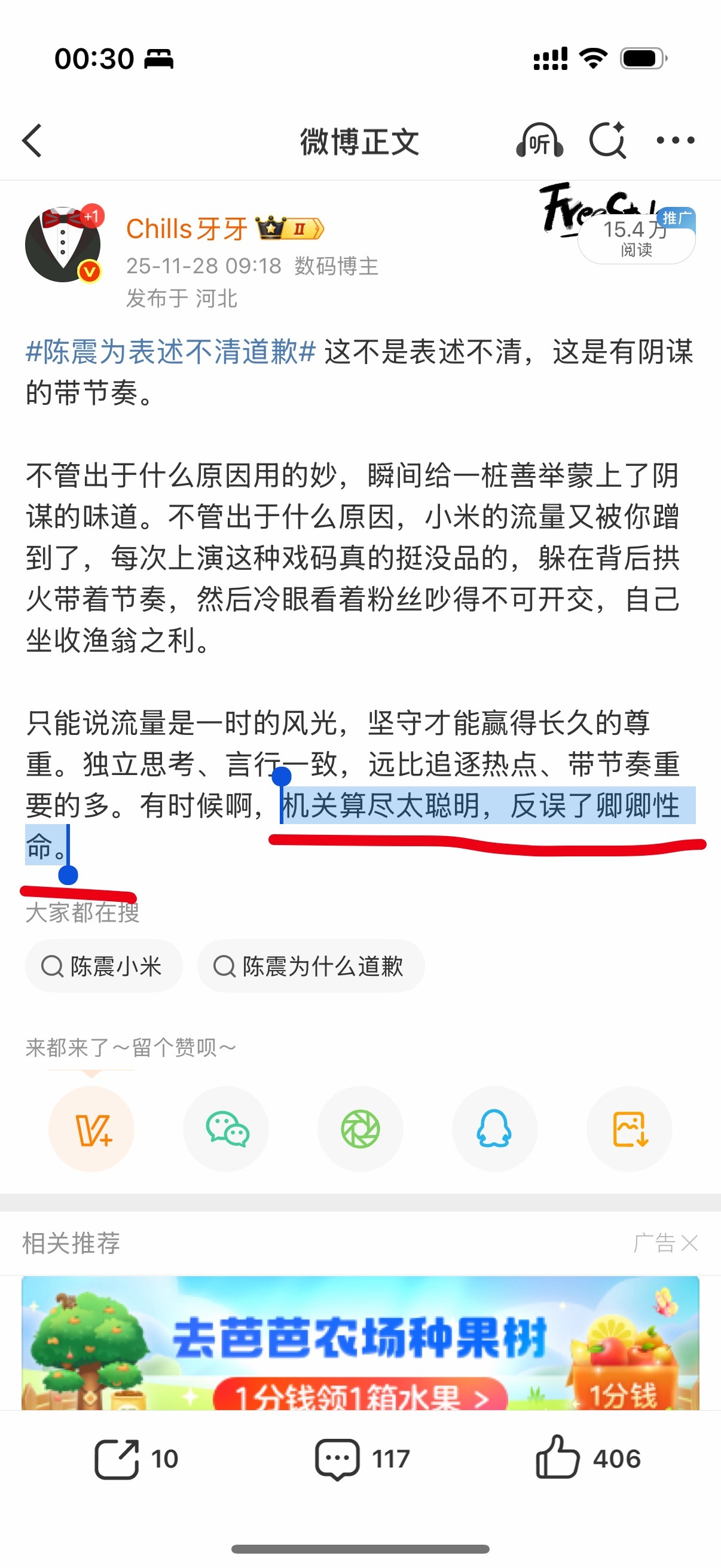 陈震被禁言陈震被全网禁言了?我前几天说什么来着?机关算尽太聪明,反误了卿卿性命。 自作孽不可活,这次是禁言,如果还继续阴阳带节奏,全网封杀也是迟早的事儿。