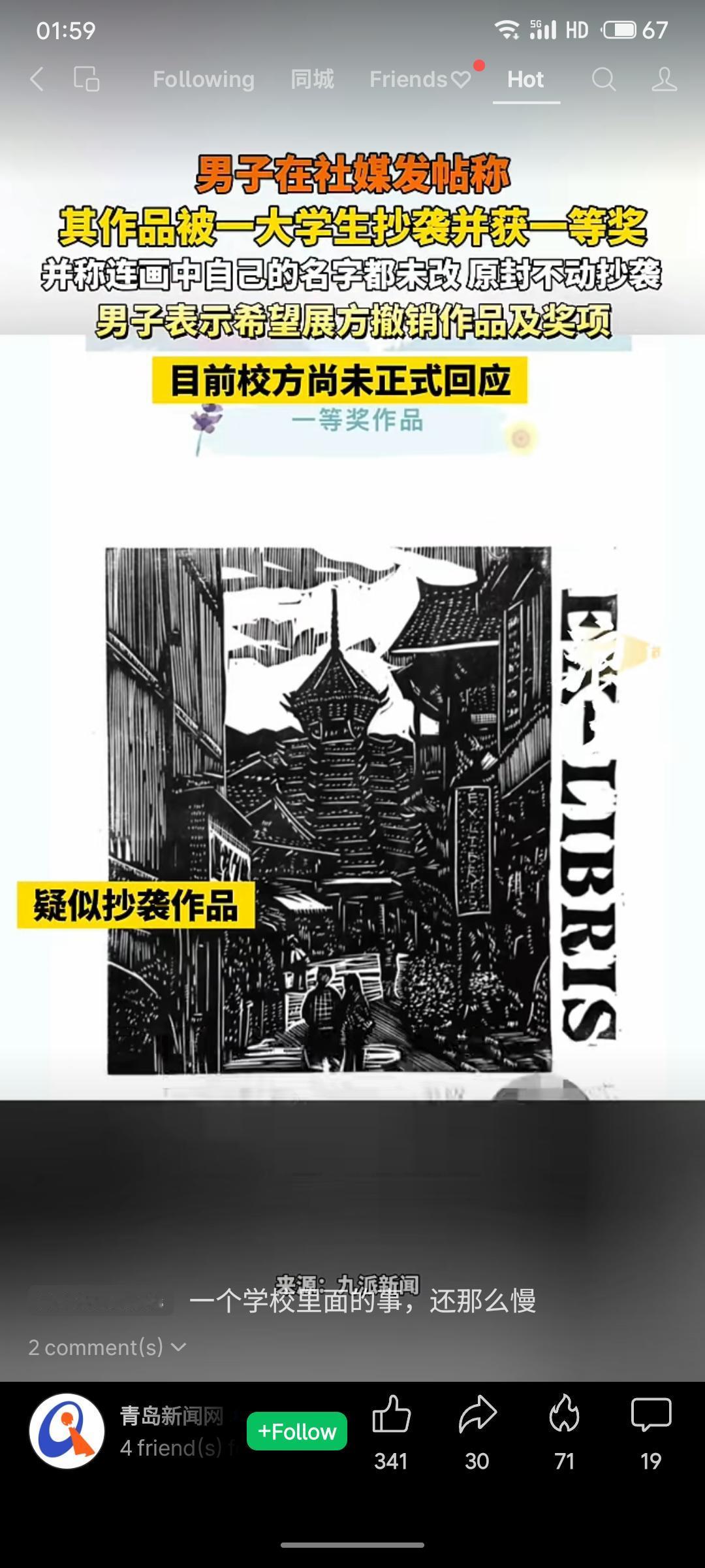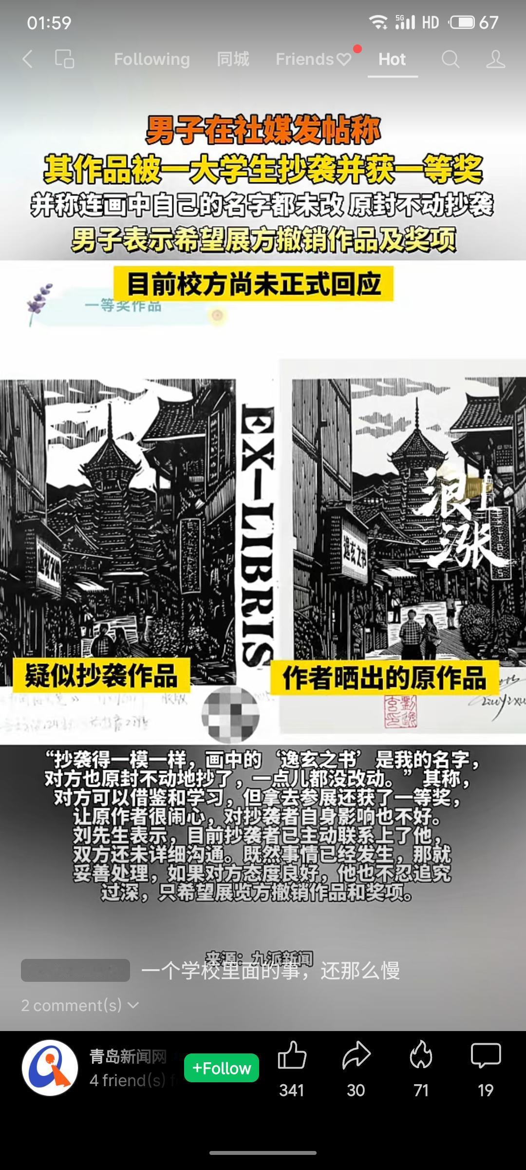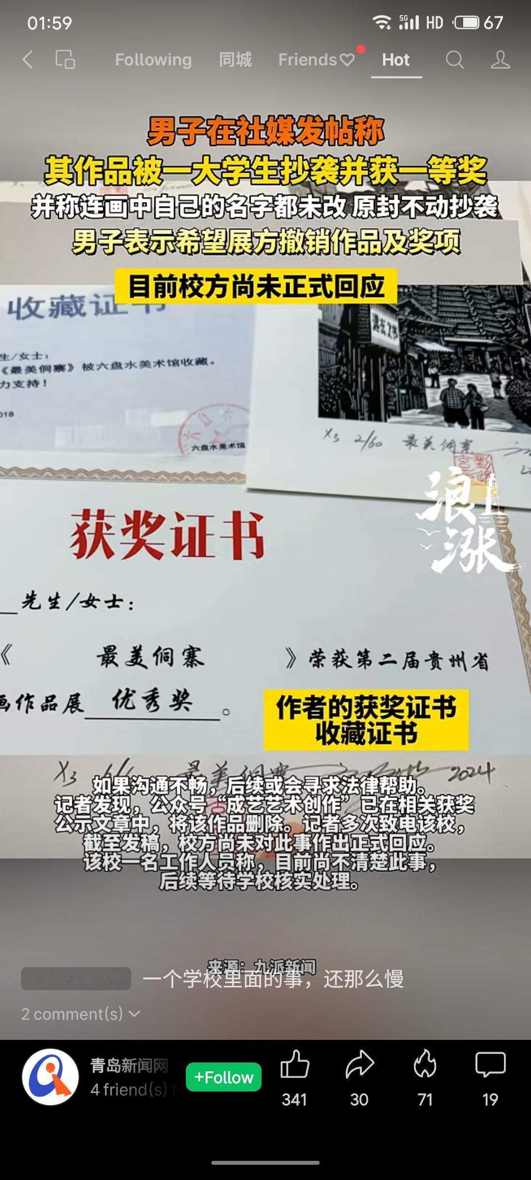 男子在社交媒体发帖,称其版画作品《最美侗寨》被成都一大学生抄袭,连画中署名“逸玄之书”都未改动。该抄袭作品在校内展览中获一等奖。男子要求撤销奖项,目前校方尚未正式回应。