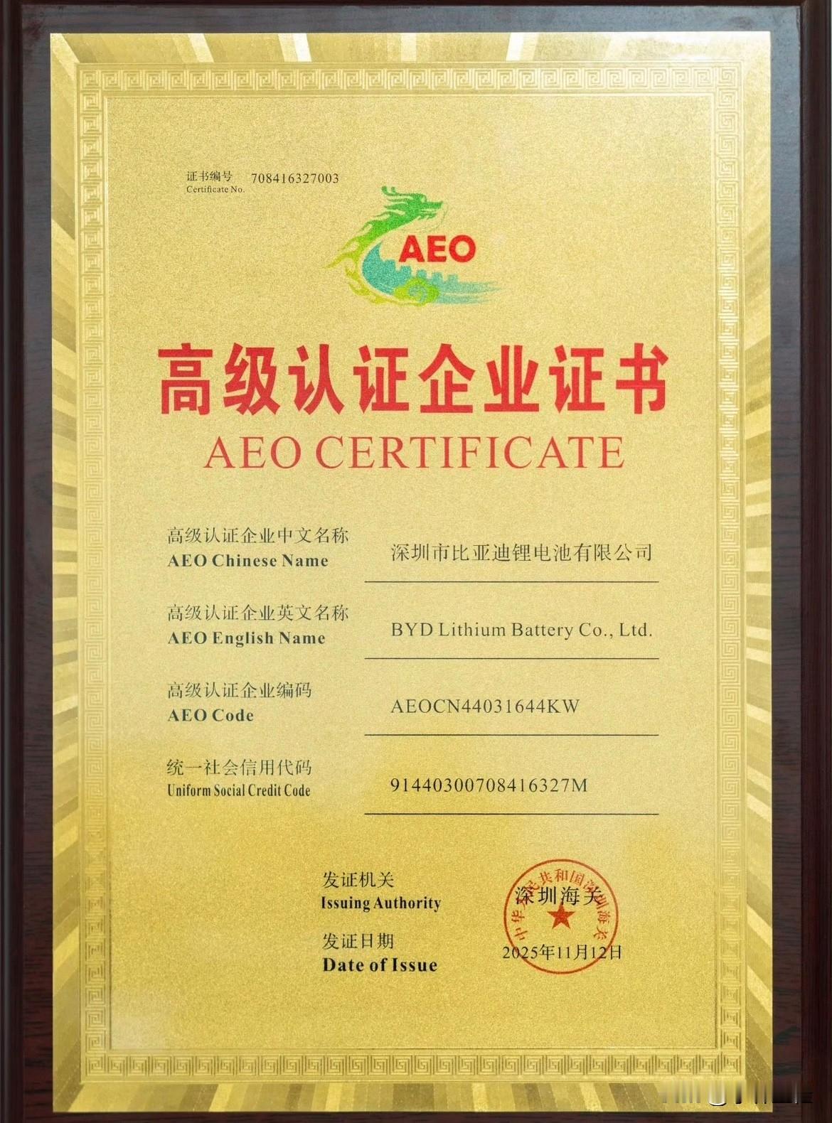 比亚迪:“兄弟们,大家帮我看看,这个AEO认证证书如何?” 恭喜,比亚迪电池获得深圳海关首次跨隶属AEO高级认证企业证书,也是深圳关区唯一获得三大隶属海关联合认证的集团企业! 话说,有没有懂行的来说说,比亚迪这个AEO高级认证证书的含金量到底有多少?莫不是交了钱就能拿到吧?[呲牙]