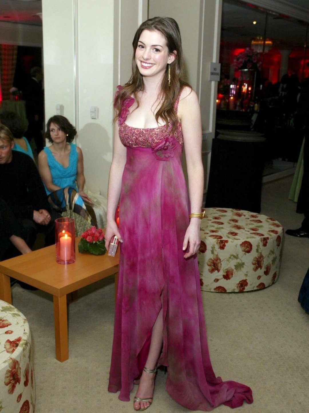 好明艳!21岁的安妮海瑟薇出席2003年金球奖红毯,一袭粉色纱裙 衬的她又娇媚又明艳 成为全场焦点