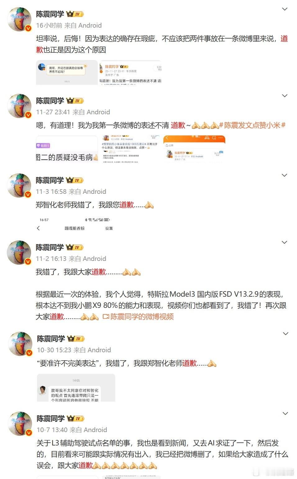 不太认识陈震,一看主页不知道啥时候关注的作为大V更应该要谨慎发言,说真话、不跟风、不造谣今年以来被禁言的博主,都有哪些?1. 户晨风:在好几个平台瞎编“安卓人”“苹果人”那套,故意挑事儿让大家对立,现在所有相关账号都给封了。2. 郭美May努力努力(微博):老发些炫富、鼓吹拜金的内容,价值观特歪,账号要么封了要么长期不让说话。3. 亿颜LuLu(小红书):跟上面那位类似,老炫富搞拜金那套,账号也没跑了,要么封要么长期禁言。4. 忘川(快手):同上,满屏炫富拜金,不良价值观输出,账号被封或长期禁言。5. Ayuki_888(抖音):还是炫富拜金那事儿,价值观不行,账号要么封了要么长期不让发内容。6. 周熙凯XK(微信视频号):依旧是炫富拜金,传递坏风气,账号被封或长期禁言。7. 阑夕(微博):发那种介绍境外色情影片的内容,账号被限了一段时间不能说话。8. 张雪峰(抖音):直播的时候满嘴脏话,说了好长时间,现在账号被限言,还不让播了。9. 小影夫妇(抖音、快手等):因为偷税被查了,现在账号长期禁言、不让播,连带货赚钱的权限也给停了。10. 曳步舞鑫鑫(抖音、快手等):也是偷税的事儿,结果一样,长期禁言停播,带货权限也没了。11. 王子柏:之前就因为偷税、炫富被封过号,最近又偷偷注册新号,网信部门已经让平台去查、去处理了。陈震陈震多平台被禁言 陈震