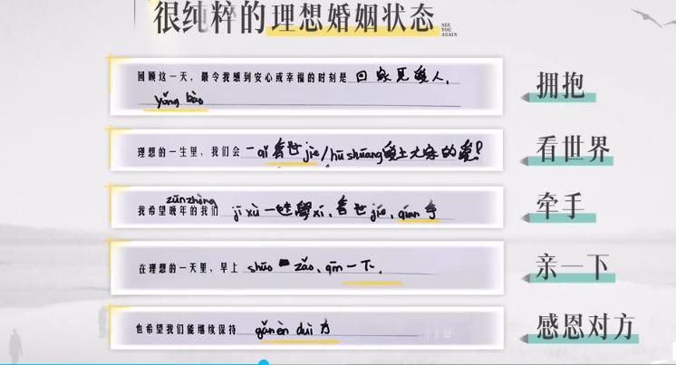 粱淞这是在嘲讽李施嬅四十多岁的人了,还这么少女心吧?说她写的理想婚姻规划书少女感爆棚。李施嬅还笑着回答她的要求很简单,李维嘉也吐槽说,这要求可不简单。 再见爱人5这一期要求每一位嘉宾都要书写自己理想的婚姻规划书。 李施嬅读完了自己的规划书之后,粱淞说,如果他不认识李施嬅,也没有和她相处过,仅仅是从她写的规划书来看,他会认为这是二十岁的少女写出来的东西,少女感爆棚。车崇健表示,她本来就是施公主啊! 李施嬅的理想婚姻规划书上全是拥抱、牵手、一起看世界、亲一下以及感恩对方,基本上是很理想很纯粹的婚姻状态。 李施嬅说,就是因为她的爷爷和奶奶老的时候依然还很相爱,爷爷去哪里有牵着奶奶的手。她也羡慕这种心灵可以相互连接的伴侣。这是很简单的事情,但是她和车崇健在一起就没有这种心灵相连的感觉。 李维嘉在观察室里看到这段视频的时候说,这可不简单。 其实粱淞这么说也很可能就是在嘲笑李施嬅太理想化不成熟吧?虽然他解释说是回归初心,但是李施嬅已经44岁了,提出的要求还这么有少女心,怎么听着不像是在夸奖她。 大家有没有同样的感受?