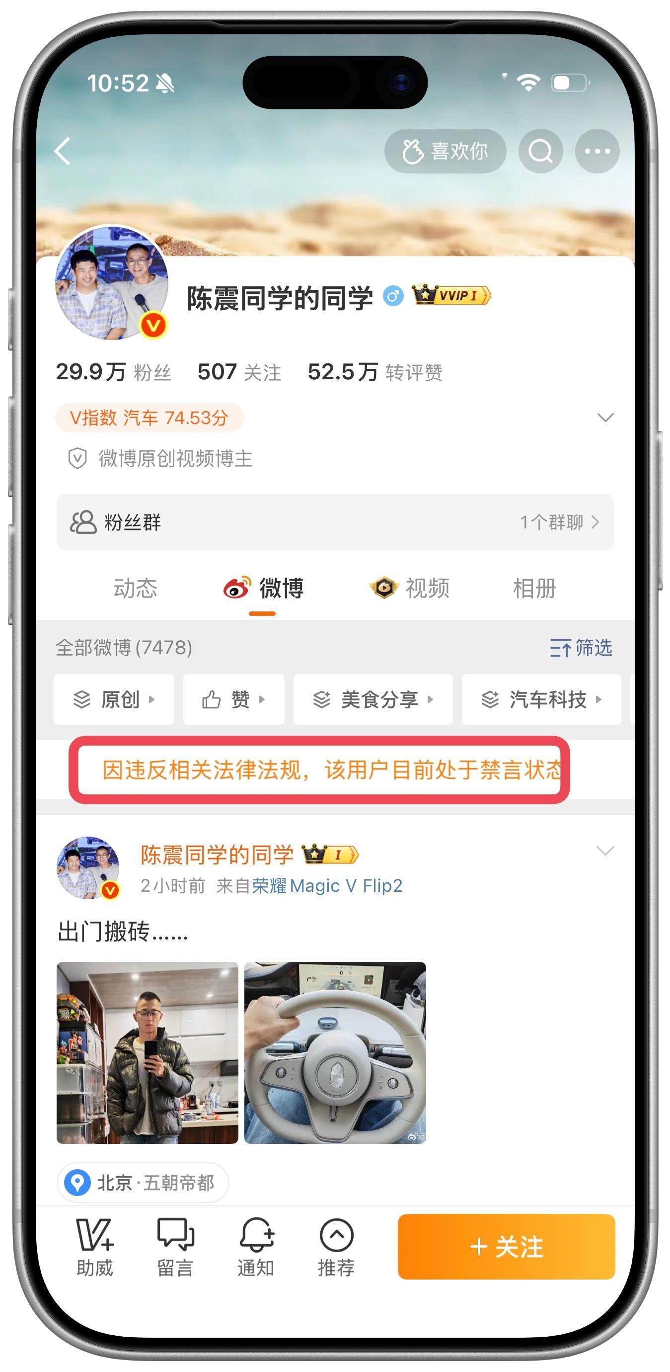 刚刚,陈震的小号也被禁言了。看来这事有点大啊陈震多平台被禁言
