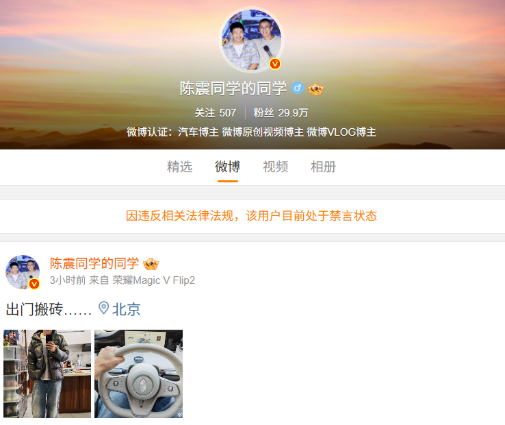 【 微博显示,因违反相关法律法规,该用户目前处于禁言状态。抖音平台显示,账号“陈震同学”因违反法律法规和政策,该用户处于禁言状态。快手平台显示,账号“陈震同学”因不符合社区规范,已被禁言。小红书平台显示,其账号因违反相关社区规则,已被禁言。陈震B站账号主页显示,该账号封禁中。经统计,陈震全网粉丝超过2400万。主号被封之后,陈震本人通过另一个账号发视频回应称:“这事早上起来看到之后,确实也有一点突然,但也没什么可说的,自作自受,多检讨自己吧。其实冷静下来想一想,这事很值得反思的点就在于流量很大,其实应该给大家带来更多一些乐观的正能量,而不是一些很激烈的言辞。没什么说的,反正以后注意吧,也感谢大家发来的这些安慰的私信。然后还是那句话,吃一堑长一智,好好反思反思。” 最新显示,回应视频已不可见,该账号也被禁言(综合)