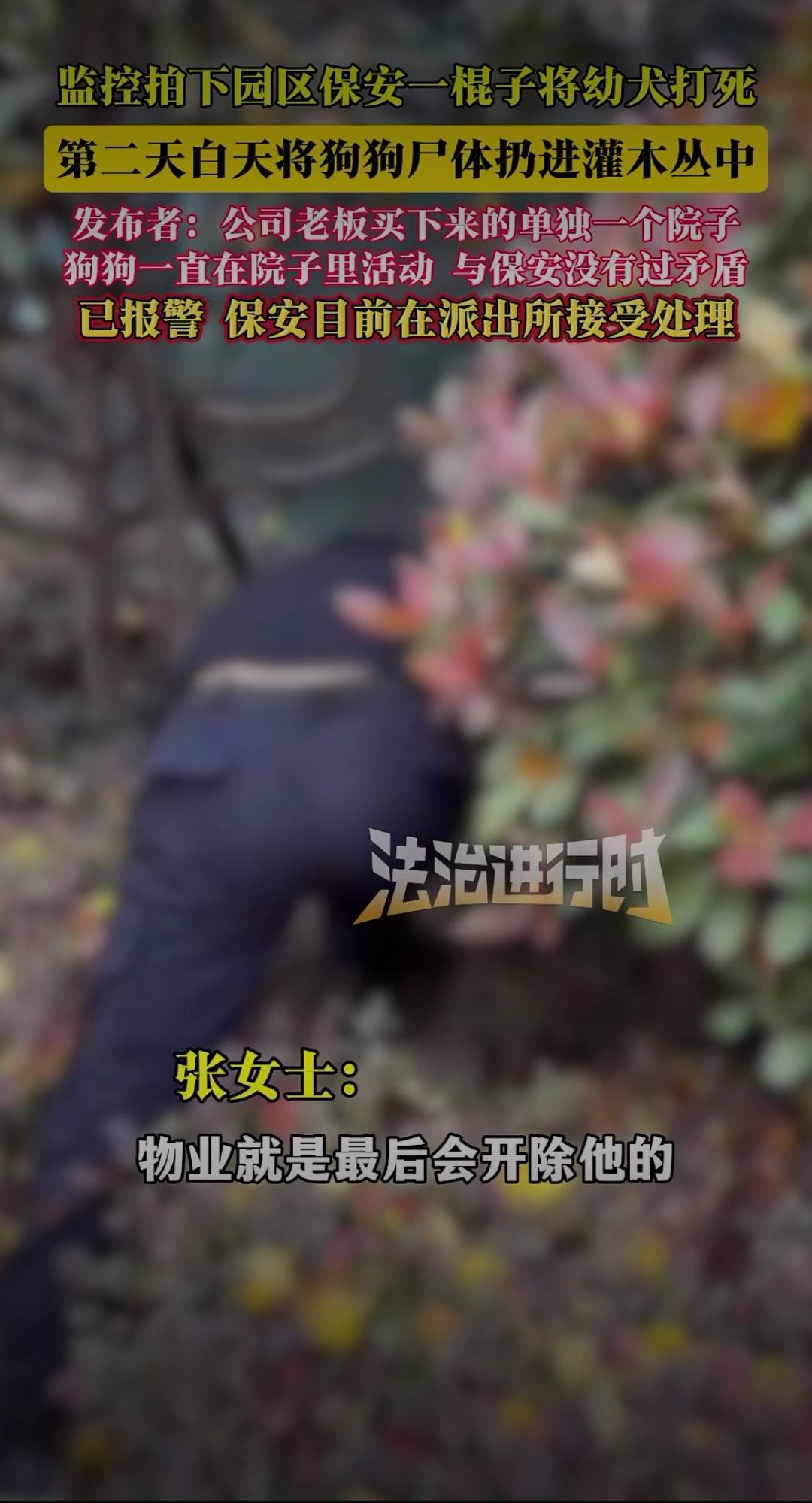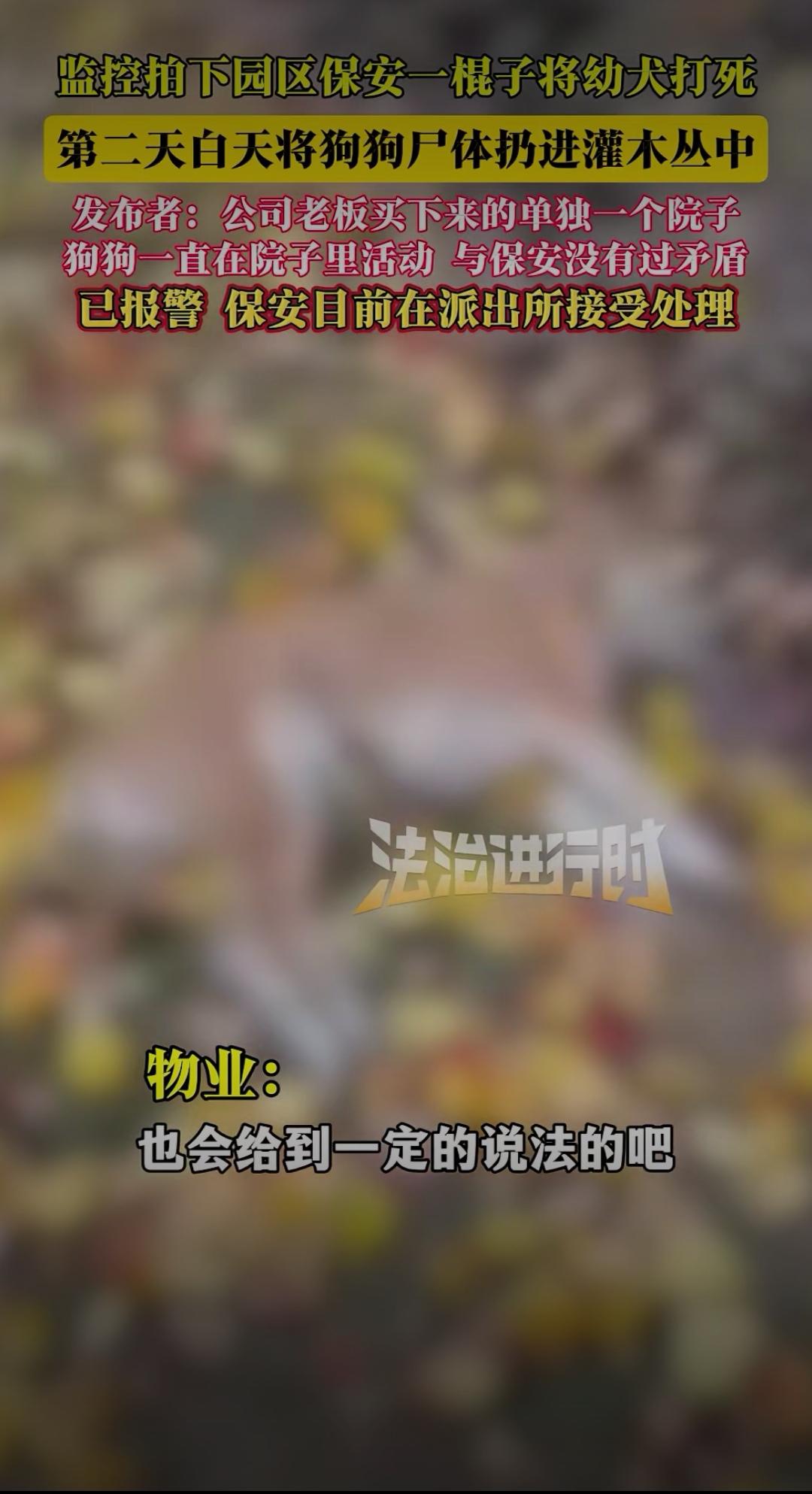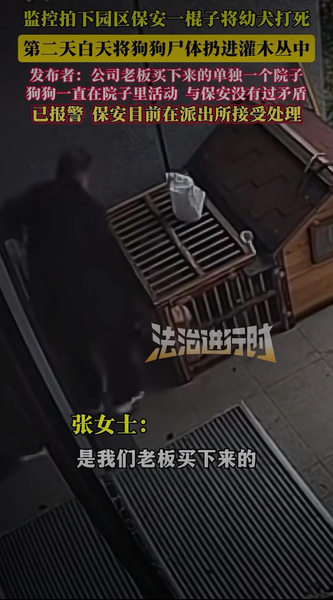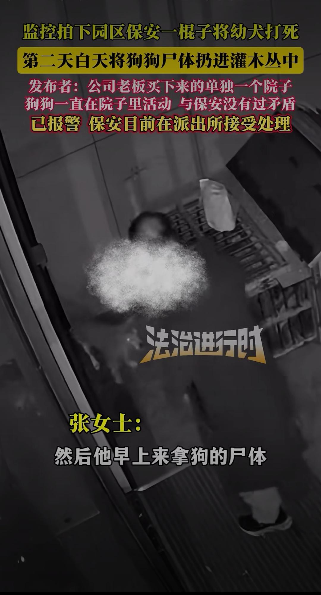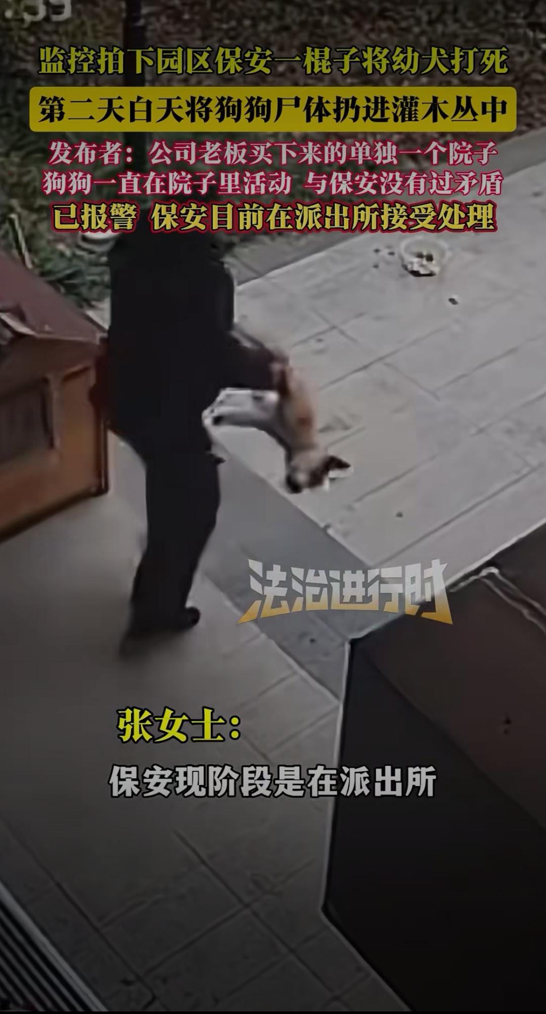 监控曝光!保安一棍打死园区幼犬:善良可以缺席,但不能施暴 爱护动物敬畏生命 监控拍下园区保安一棍子将幼犬打死,第二天白天将狗狗尸体扔进灌木丛中。发布者透露,这只狗狗是公司老板买下单独院子后饲养的,一直只在院子里活动,和保安没有过任何矛盾,目前已报警,保安正在派出所接受处理。 这段监控视频让无数网友愤怒到发抖:画面中,幼犬正乖巧地在院子角落踱步,保安突然手持木棍闯入,毫无征兆地朝着狗狗狠狠挥下。幼犬惨叫一声倒地,挣扎着想要爬起,保安却没有丝毫犹豫,又补了数棍,直到狗狗彻底没了动静。第二天,他趁无人注意,偷偷将狗狗尸体拖进附近灌木丛,试图掩盖痕迹。 狗狗的主人得知消息后悲痛不已,他说这只幼犬才6个月大,性格温顺黏人,平时从不乱叫扰民,没想到会遭遇如此残忍的对待。“它只是一只不会说话的小动物,就算有什么问题,完全可以沟通解决,为什么要下死手?” 网友们的怒火瞬间被点燃:“这哪里是保安,分明是施暴者!”“没有矛盾却痛下杀手,这种冷血太可怕了”“连小动物都不忍伤害的人,才配谈善良;随意践踏生命的人,内心得有多阴暗”。更有人质疑:保安的职责是保护园区安全,而非滥用暴力,如此残忍的行为,是否隐藏着更可怕的人格缺陷? 这起事件早已超出“处理宠物”的范畴,本质上是对生命的漠视。狗狗没有反抗能力,却成了他人暴力情绪的宣泄对象。在这个强调文明的社会,尊重生命从来不是选择题,而是每个人的底线——无论是人,还是弱小的动物。 保安的行为终究逃不过法律和道德的制裁,目前警方已介入调查,等待他的必将是应有的惩罚。这起悲剧也提醒我们:善良或许不是每个人的本能,但施暴绝对不能被容忍。你如何看待保安的行为?要不要我帮你整理观点,写成更具感染力的评论文案,呼吁大家敬畏生命?