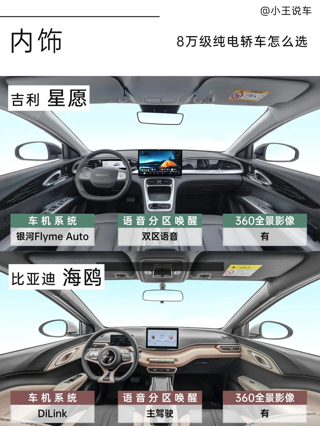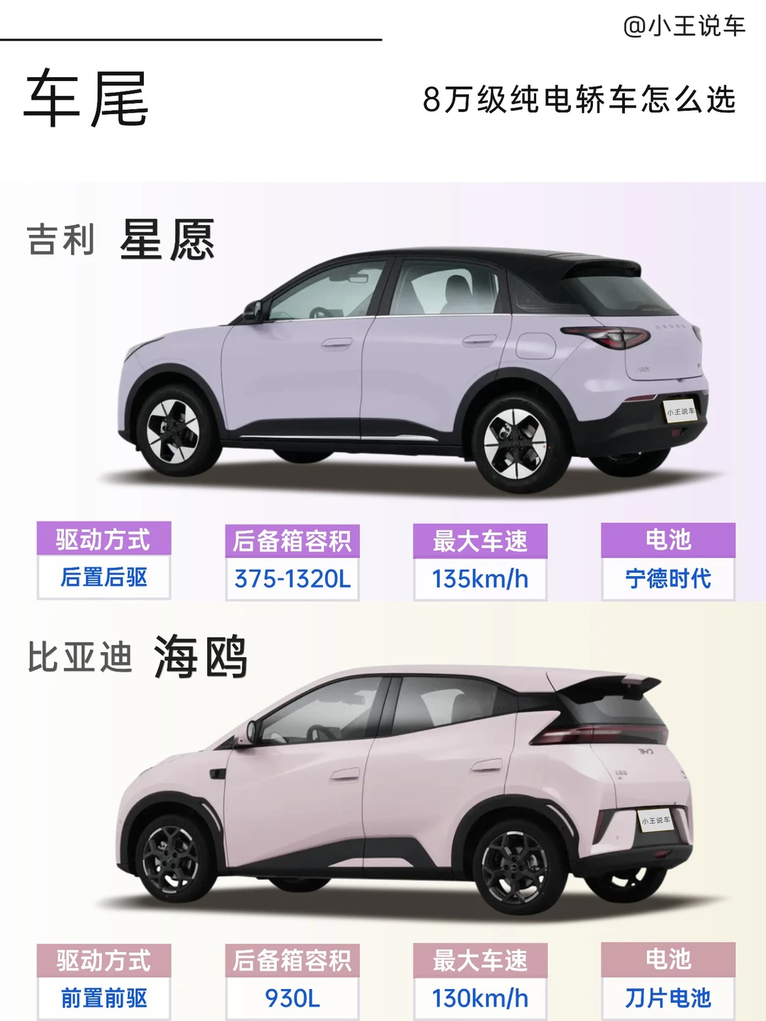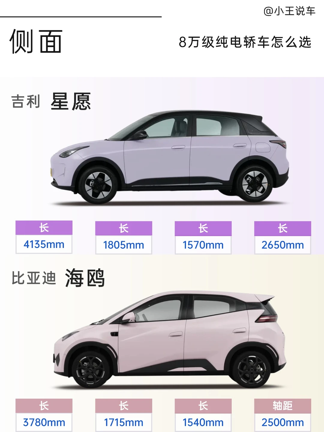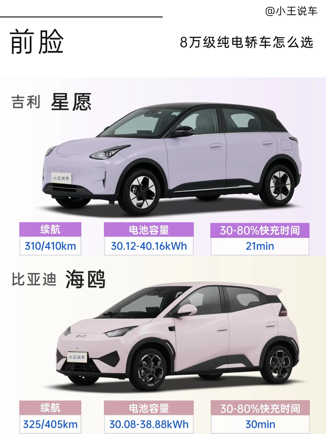 🚗外观 🔺星愿:冰莓粉双拼配色很吸睛,圆润线条搭配微笑前脸与三角大灯,整体造型温和讨喜,很符合女性审美 🔺海鸥:造型偏向运动风格,棱角分明的设计搭配犀利C型灯与俯冲腰线,视觉冲击力强,个性十足 🧸内饰 🔺星愿:配备14.6英寸大屏,显示效果出色;副驾设有隐藏抽屉,可放置随身物品,36处储物格设计,能轻松收纳各类物品 🔺海鸥:10.1英寸旋转屏使用灵活,导航时竖屏显示更清晰;织物座椅材质耐脏易打理,日常使用无需过多维护,较为省心 🧠智驾 🔺星愿:540°全景影像功能实用,搭配底盘透视,🌟无论是小区窄路会车还是商场侧方停车,视野都十分清晰,新手也能轻松完成停车 🔺海鸥:高速领航功能表现可靠,支持自动上下匝道与智慧礼让大车,长途驾驶时能有效减轻操作负担,提升出行安全性 🧳空间 🔺星愿:后排腿部空间充裕,70L前备箱与可扩展至1320L的后备厢,储物能力出色,家庭出行或采购物品时优势明显 🔺海鸥:3.78米的车长使其灵活性突出,在老旧小区等狭窄路段也能轻松完成掉头,标准后备厢空间满足日常通勤储物需求 ⚡动力 🔺星愿:采用后置后驱布局,驾驶感受灵动,0-50km/h加速仅需3.9秒,⚡️起步响应迅速,过弯稳定性好,能带来不错的驾驶体验 🔺海鸥:前置前驱设计侧重稳定性,方向盘转向轻盈,操控难度低,⚡️雨天等复杂路况下行驶平稳,新手驾驶也能保持从容 🛡️安全 🔺星愿:配备6气囊与神盾电池系统,电池通过针刺测试无起火风险,✔️高强度车身在碰撞测试中表现优异,安全保障全面,家庭使用更放心 🔺海鸥:搭载口碑可靠的刀片电池,环抱式车身抗撞性能强,✔️获得中汽测评3A评级,安全性能经过市场检验,独自出行也能安心 🔋续航:快充快vs衰减少 🔺星愿:长续航版本CLTC续航410km,满足一周通勤需求;🌟30%-80%快充只要21分钟,补能效率高,周末短途出行不用担心续航问题 🔺海鸥:续航表现扎实,305km版本实测续航可达290km,冬季续航衰减控制较好;🌟百公里电耗10.1度,能耗成本低,长期使用更经济 👀买车没有好坏,适合的就是最好的,你说呢?
