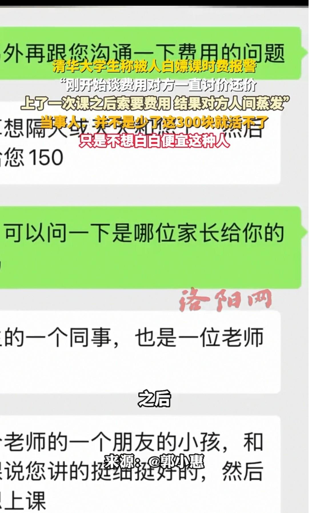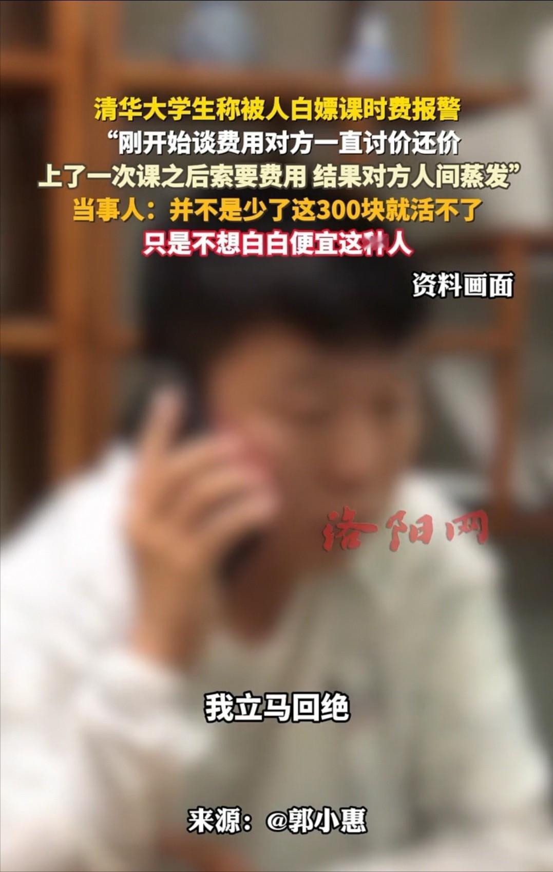 “想白嫖?”北京,一位清华大学的男同学到派出所报警了,声称一位高三同学的家长请他帮忙辅导数学,说好的一个半小时300元,结果人间蒸发了。他说自己并不是非要这300元,只是不想便宜了这种人,才选择这样的处理方式。 300 块钱,对清华学子来说或许不算什么,但为了这 300 块,北京一位清华男同学却专门跑了趟派出所报警。起因很简单,他帮高三学生补了次数学,家长说好一个半小时 300 元报酬,结果课一结束,对方就彻底失联,这波 “白嫖” 操作,让他实在咽不下这口气。 事情的源头是一次再常见不过的家教对接,这位清华男生平时会利用课余时间做家教,一方面是想赚点生活费,另一方面也能把自己的学习方法分享给需要的人。 通过学校里的兼职群,他联系上了一位高三学生的家长,对方说孩子数学成绩偏弱,离高考越来越近,急着找个名校学生突击辅导,还特意强调不心疼报酬,只要效果好就行。 两人沟通得很顺利,家长对他的清华背景很认可,当场敲定了辅导细节:每周辅导一次,每次一个半小时,报酬 300 元,辅导结束后微信转账结算。 第一次辅导定在了周末下午,男生特意提前半小时到了约定的小区,还带了自己整理的数学错题集和高频考点笔记,准备给学生做个全面的基础测评。 整个辅导过程很顺畅,他针对学生薄弱的函数和立体几何板块,讲了答题技巧和易错点,学生听得很认真,还不停点头记录,家长在一旁看着也连连表示满意,丝毫没流露出任何异样。 辅导结束后,男生收拾东西准备离开,家长热情地送他到门口,说 “辛苦同学了,钱我回头就转你”, 他想着对方态度这么好,肯定不会出问题,就没好意思当场催要,只是客气地说了句 “没关系,您方便的时候转就好”。可他万万没想到,这一转身,就成了和对方的最后交集。 当天晚上,他没等到转账,想着家长可能忙忘了,就没主动提醒。可接下来的两天,微信消息发过去石沉大海,打电话也始终无人接听,他试着在之前联系的兼职群里找对方,却发现自己早已被拉黑。 这时候他才反应过来,自己是被 “白嫖” 了,对方从一开始就没打算付这笔报酬,之前的热情和认可,不过是为了让他好好辅导的伪装。 身边朋友得知后,有人劝他算了,300 块钱不值得浪费时间精力,报警也未必有结果。但男生却不这么想,他觉得这不是钱的问题,而是对方的诚信问题,不能就这么便宜了这种不讲信用的人。 抱着这样的想法,他整理好和家长的聊天记录、辅导时的笔记照片等证据,走进了附近的派出所报警。 民警接待他后,详细询问了事情的经过,做了完整的询问笔录,还告诉他这类情况属于民事纠纷,派出所会先尝试联系对方进行调解。 如果能联系上家长,会督促对方履行支付报酬的义务;要是联系不上,或者对方拒绝调解,就会告知他可以通过向法院提起民事诉讼的方式维权。 其实这种家教被 “白嫖” 的情况,在大学生兼职群体中并不少见,有的家长以 “孩子成绩没提升” 为由拒绝付款,有的则像这位家长一样直接失联,还有的会被中介以 “信息费” 为名骗取钱财后拉黑今日头条。 男生的这份坚持,提醒着更多做兼职的大学生,要学会用法律武器保护自己的合法权益。诚信是为人处世的基本准则,不管是家长还是兼职者,都该坚守这份底线。 对此,你们有什么看法,欢迎评论留言~