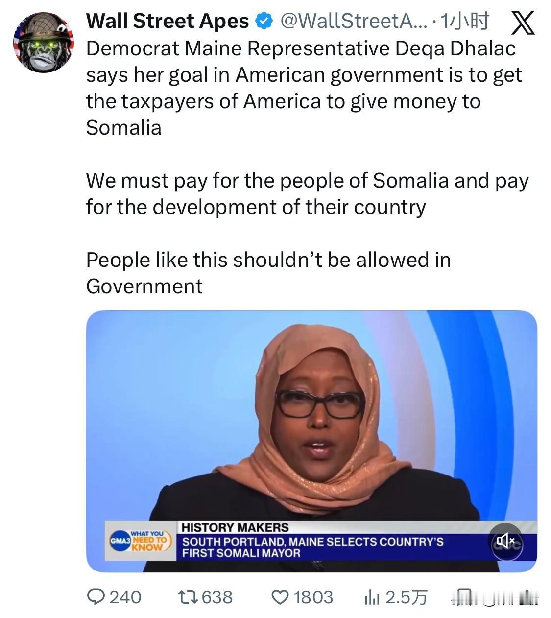美国缅因州民主党众议员德卡·达拉克表示,她进入美国政府的目标是让美国纳税人向索马里提供资金。我们必须为索马里人民付出代价,为索马里国家的发展付出代价。 缅因州民主党众议员德卡·达拉克 (Deqa Dhalac) 在美国创下了多项历史记录。她是美国第一位在非洲出生的女性市长,也是缅因州首批索马里裔美国立法者之一。 达拉克目前是缅因州众议院第120选区的代表,目前正在服务她的第二个任期,任期将于2026年结束。 在2021年至2022年期间,她担任南波特兰市(South Portland)市长,成为美国历史上第一位非洲裔女性市长和第一位索马里裔美国市长。 1992年,为躲避索马里内战,达拉克移民到美国,最初定居在佐治亚州亚特兰大,后于2005年移居缅因州。