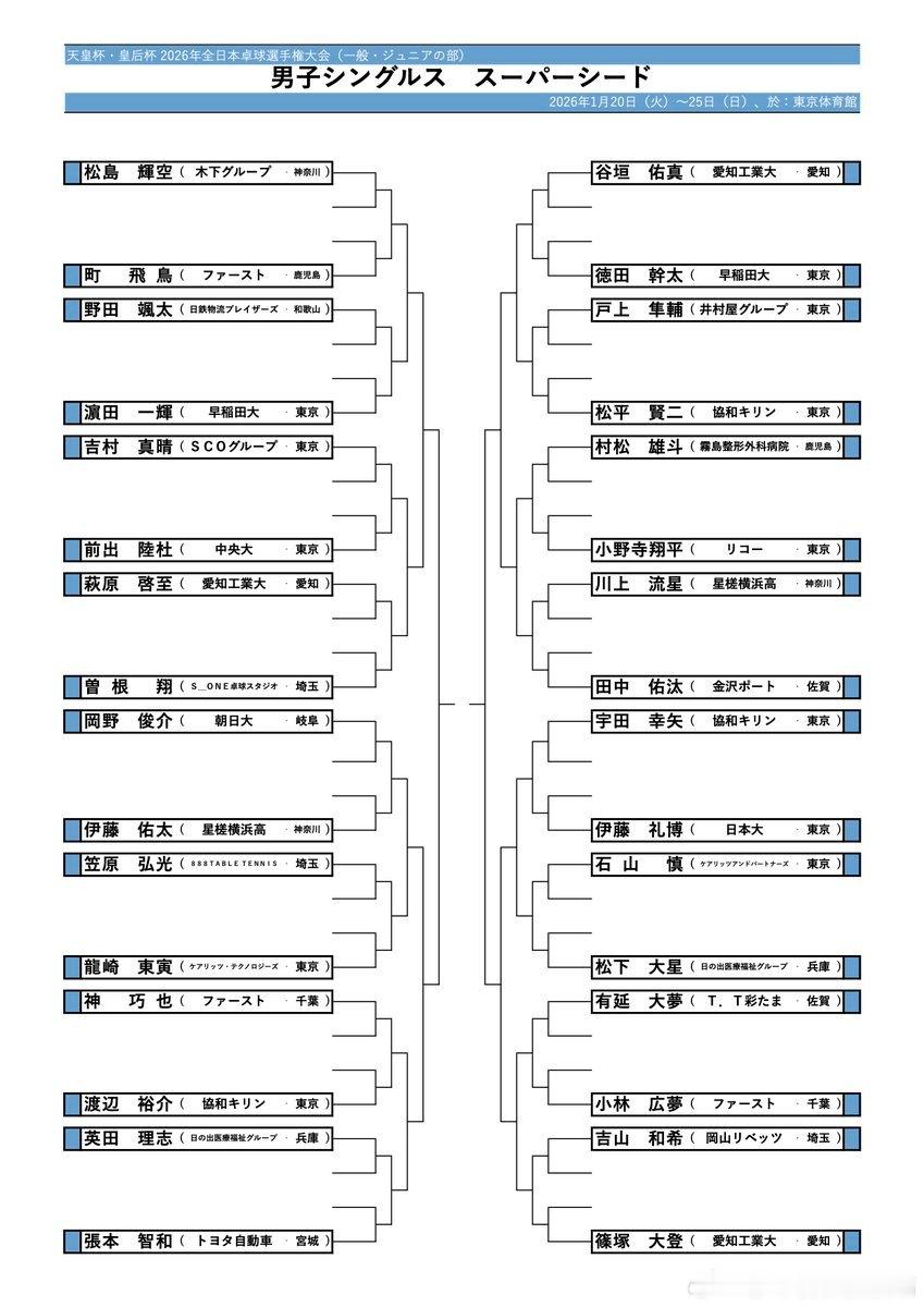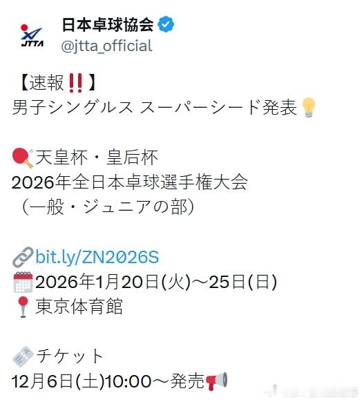 全日本乒乓球锦标赛2026张本智和 251205 JTTA公布种子选手名单。张本智和参加成年组男单比赛,作为前四种子,落位2/4区。比赛将在2026年1月20日至26日分别在东京和名古屋举行。12月6日开始售票。“【突发新闻‼️ 】男单超级种子选手名单公布💡🏓皇帝杯/皇后杯2026年全日本乒乓球锦标赛(成人组和青少年组)🔗网页链接🗓️ 2026年1月20日(星期二)至1月25日(星期日)📍东京体育馆🎫票12月6日星期六上午10:00开始发售📢” (机翻)Cr:JTTA