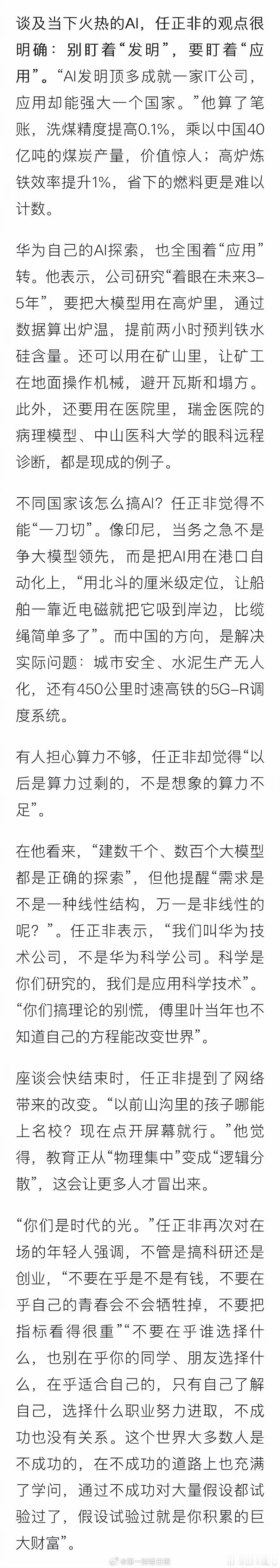 任正非称未来的希望在青年!他鼓励年轻人冲击科技高峰,同时要创业也大有前途。 近日,华为创始人任正非在位于上海的华为练秋湖研发中心与ICPC全球优胜者及教练座谈,围绕AI未来、教育本质与青年成长展开对话。他认为,当前处于快速变动的时代,年轻人放射着青春光芒,是同辈人的榜样,时代的希望寄托在青年人身上。对于青年发展,任正非指出,每个人人生道路不同,有人“摸高”探索前沿,有人“摸低”扎根基础,都是对社会的贡献。