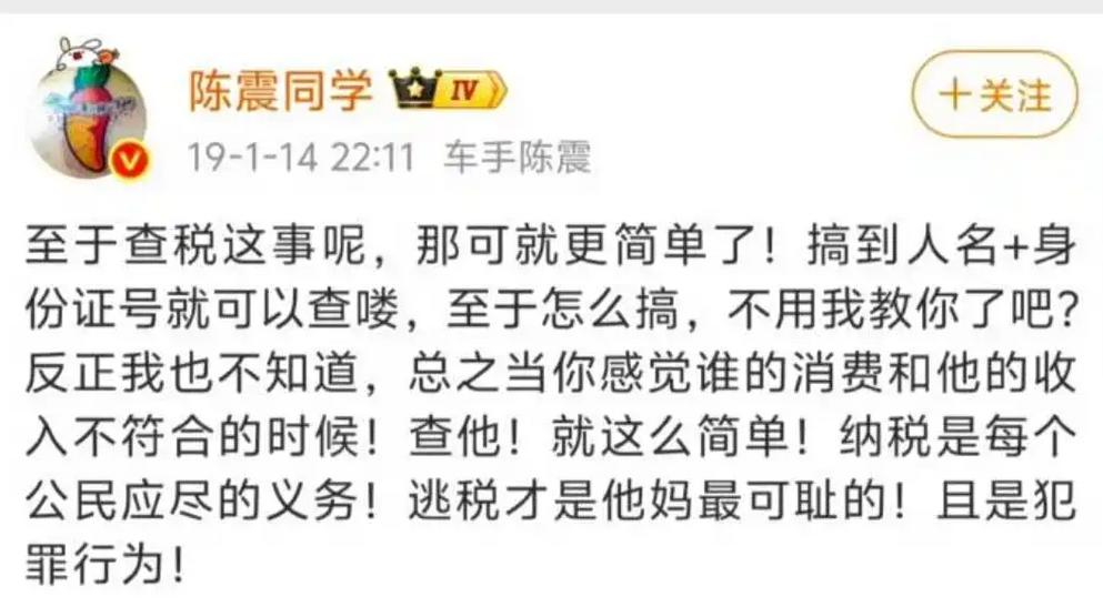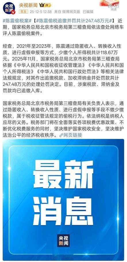 多个社交媒体平台账号已被禁言 知名车评人陈震偷税被查 12月5日,央视新闻发文,近期,国家税务总局北京市税务局第三稽查局依法查处网络车评人陈震偷税案件。 经查,2021年至2023年,陈震通过隐匿收入、转换收入性质、进行虚假申报等方式,少缴个人所得税共计118.67万元。2025年11月,国家税务总局北京市税务局第三稽查局依据《中华人民共和国税收征收管理法》《中华人民共和国个人所得税法》《中华人民共和国行政处罚法》等相关法律法规规定,对其作出追缴税款、加收滞纳金并处罚款共计247.48万元的处理处罚决定。目前,涉案税款、滞纳金及罚款均已追缴入库。 陈震在2019年,曾发微博称,纳税是每个公民应尽的义务,偷税是犯罪行为,是可耻的。 账号被禁言后,陈震通过另一个账号“陈震同学的同学”发文回应称:“好好反思一下………”并在视频中表示:“没啥可说的,自作自受,多检讨自己,会好好反思,应该多给大家带来一些乐观的正能量,而不是一些很激烈的言辞,吃一堑长一智,以后会注意。” 根据公开信息,“陈震同学”视频平台近30日掉粉已近5万。 点个关注吧!汽节车社,车圈热点资讯每日一扫清!【来自懂车帝车友圈】