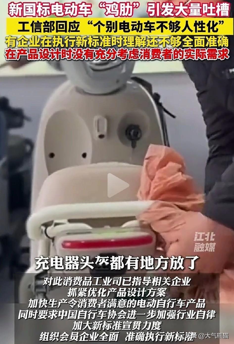 这次的回应很及时 对于新标准的电动自行车 工信部对不够人性化的方面进行了回应。 有些产品在座椅材质比较硬,随手就能拆卸怕丢了,只能坐一个人,没有储物筐,没有后视镜等方面做的不够好,是因为有个别的企业在面对新标准的时候,理解的不够全面和准确,引发了部分消费者的吐槽。 但这些企业在减少和消除火灾,安全隐患方面还是认真的执行了。 作为生产企业,肯定是愿意生产消费者满意的电动自行车,后续也会督促这些企业,多生产老百姓认可的产品。