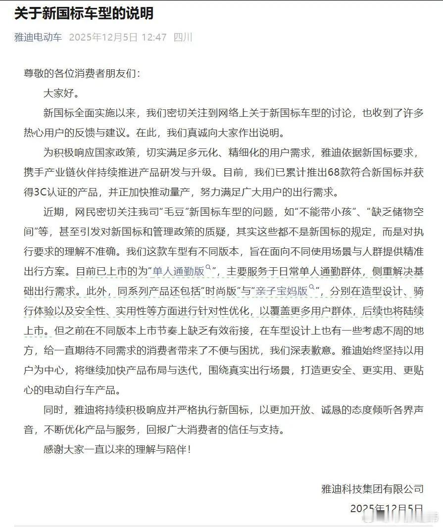 太懂事了, 雅迪电动车出来道歉了, 不是新国标的问题,也不是生产设计的问题,而是雅迪对新国标理解不到位的问题。 这些天新国标一出来,瞬间在网络上引发轩然大波,尤其是“不能带娃”的坐垫,以及“缺乏储物空间”这两点,令大众感到不理解,质疑这不太合理。 这不今天,面对大众的诟病雅迪电动车出来致歉了,发布的公告中表示这是雅迪对于新国标理解的不透彻,所以存在设计上的考虑不周。 还解释了目前这款新国标电动车是“单人通勤版”,后续还会上线新产品“亲子宝妈版”,会在造型设计上贴切用户的实用性。 不得不说,雅迪确实有担当,诚恳向大众道歉并解释了缘由,姿态放的很低,一切以用户意见为宗旨,这样的企业岂能不让人支持,也就是这样的态度企业才能更长久。 所以大家别担心,这个只是单人款,等后面肯定还会有符合能够带娃又能够储物的标准电动车产品上线的,就让我们耐心等待。 大家说是不是呢?