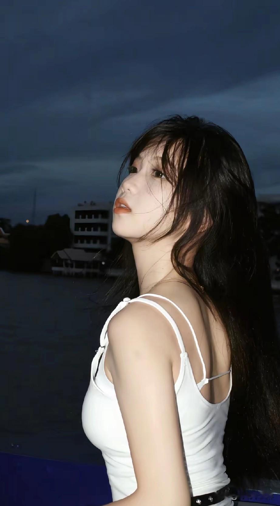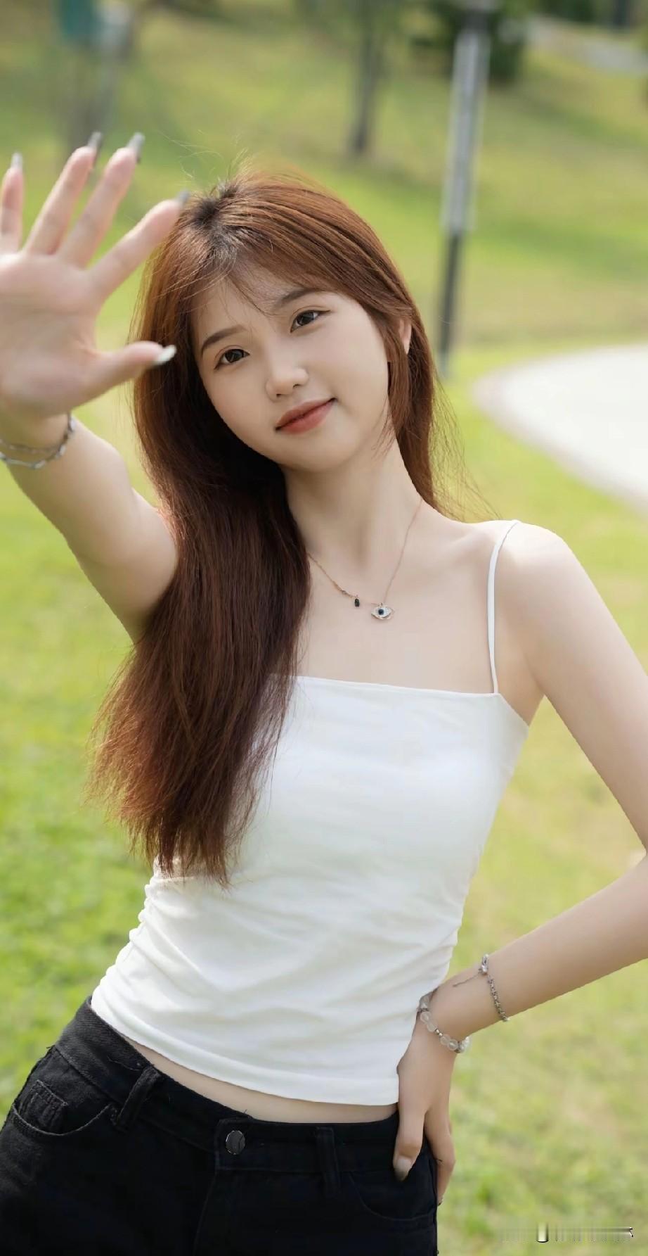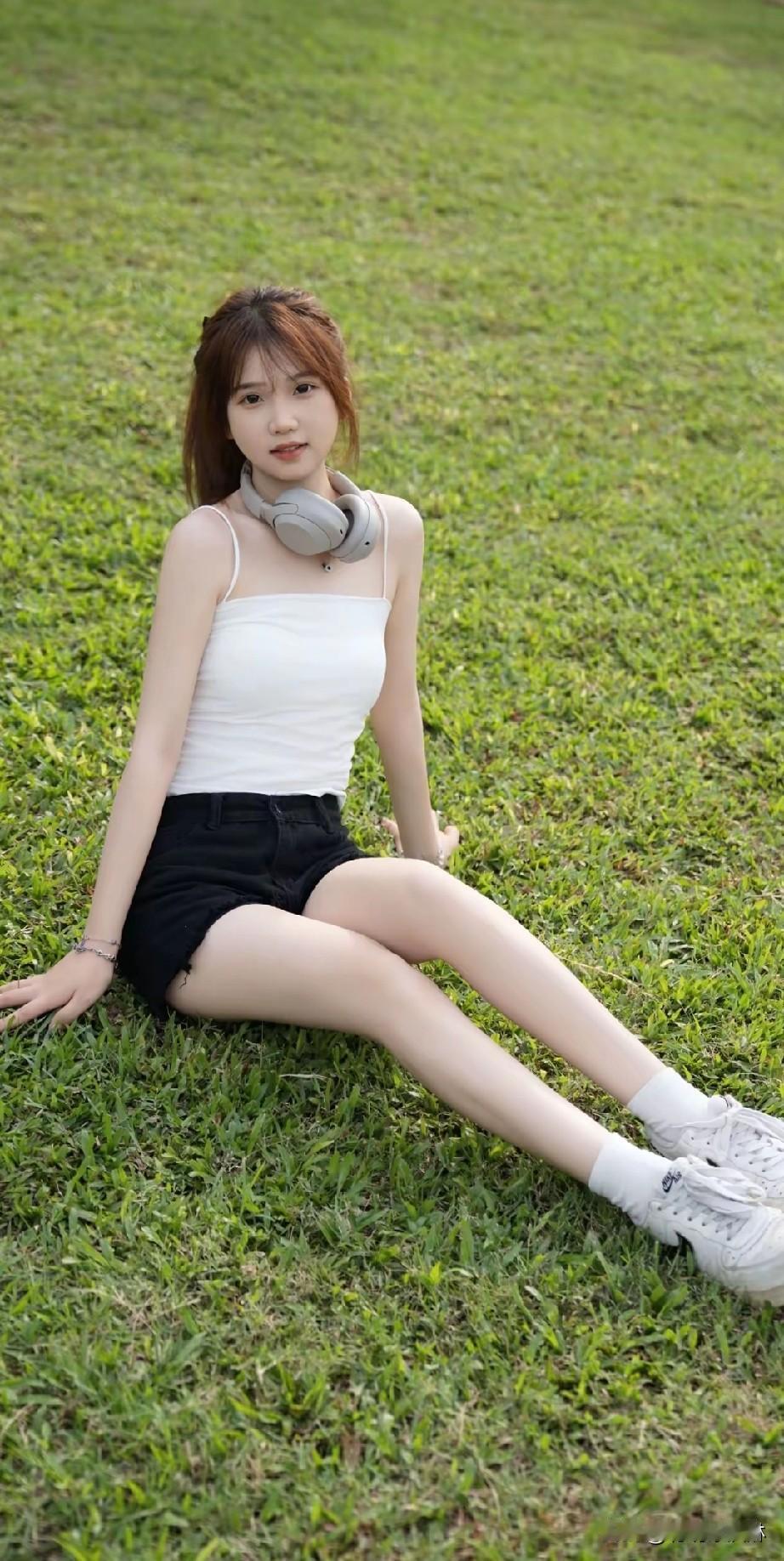 少女清新穿搭,白色背心搭配黑色短裤,草地上轻松自在。