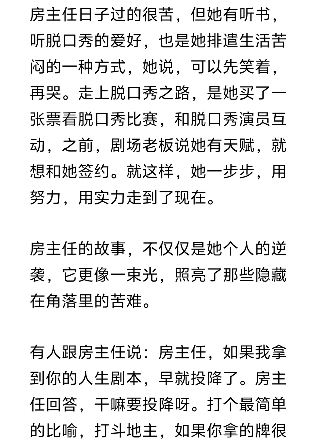 房主任日子过的很苦,但她有听书,听脱口秀的爱好,也是她排遣生活苦闷的一种方式,她说,可以先笑着,再哭。走上脱口秀之路,是她买了一张票看脱口秀比赛,和脱口秀演员互动,当时剧场老板说她有天赋,可以试试。就这样,她一步步,用努力,用实力走到了现在。