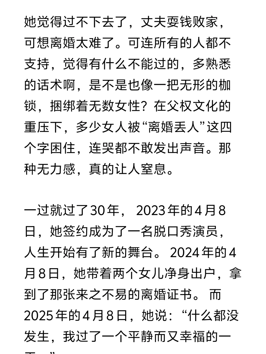 👉一过就过了30年, 2023年的4月8日,她签约成为了一名脱口秀演员,人生开始有了新的舞台。 2024年的4月8日,她带着两个女儿净身出户,拿到了那张来之不易的离婚证书。 而2025年的4月8日,她说:“什么都没发生,我过了一个平静而又幸福的一天。” 她把苦难化为幽默,把被动化为主动,用自己的方式,重新定义了生命的意义。👏👏👏