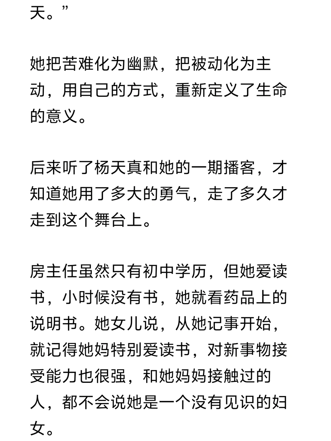 后来听了杨天真和她的一期播客,才知道她用了多大的勇气,走了多久才走到这个舞台上。房主任虽然只有初中学历,但她爱读书,小时候没有书,她就看药品上的说明书。她女儿说,从她记事开始,就记得她妈特别爱读书,对新事物接受能力也很强,和她妈妈接触过的人,都不会说她是一个没有见识的妇女。
