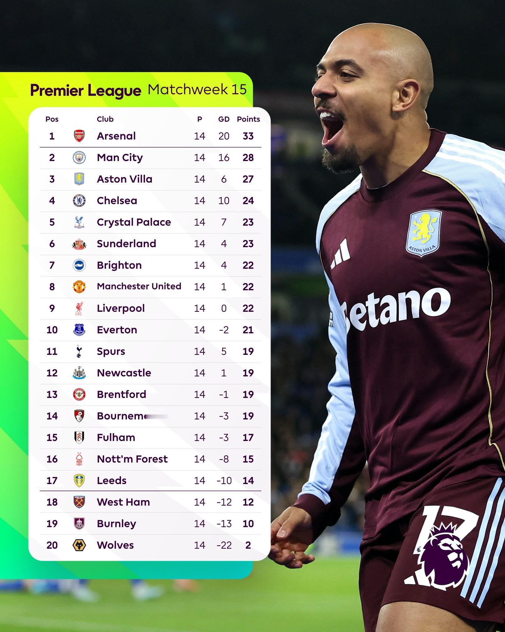 【英超积分榜】 英超 2025-26赛季英超联赛第14轮积分榜。