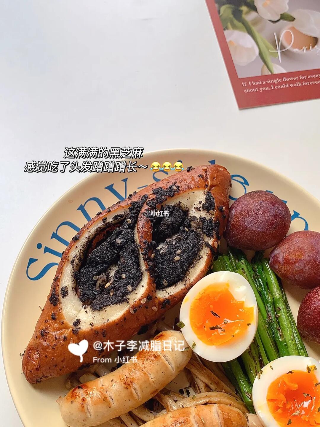 🥯早餐:鸡肉肠|西梅|冰美式|溏心蛋|黑芝麻碱水|煎芦笋|白菇|