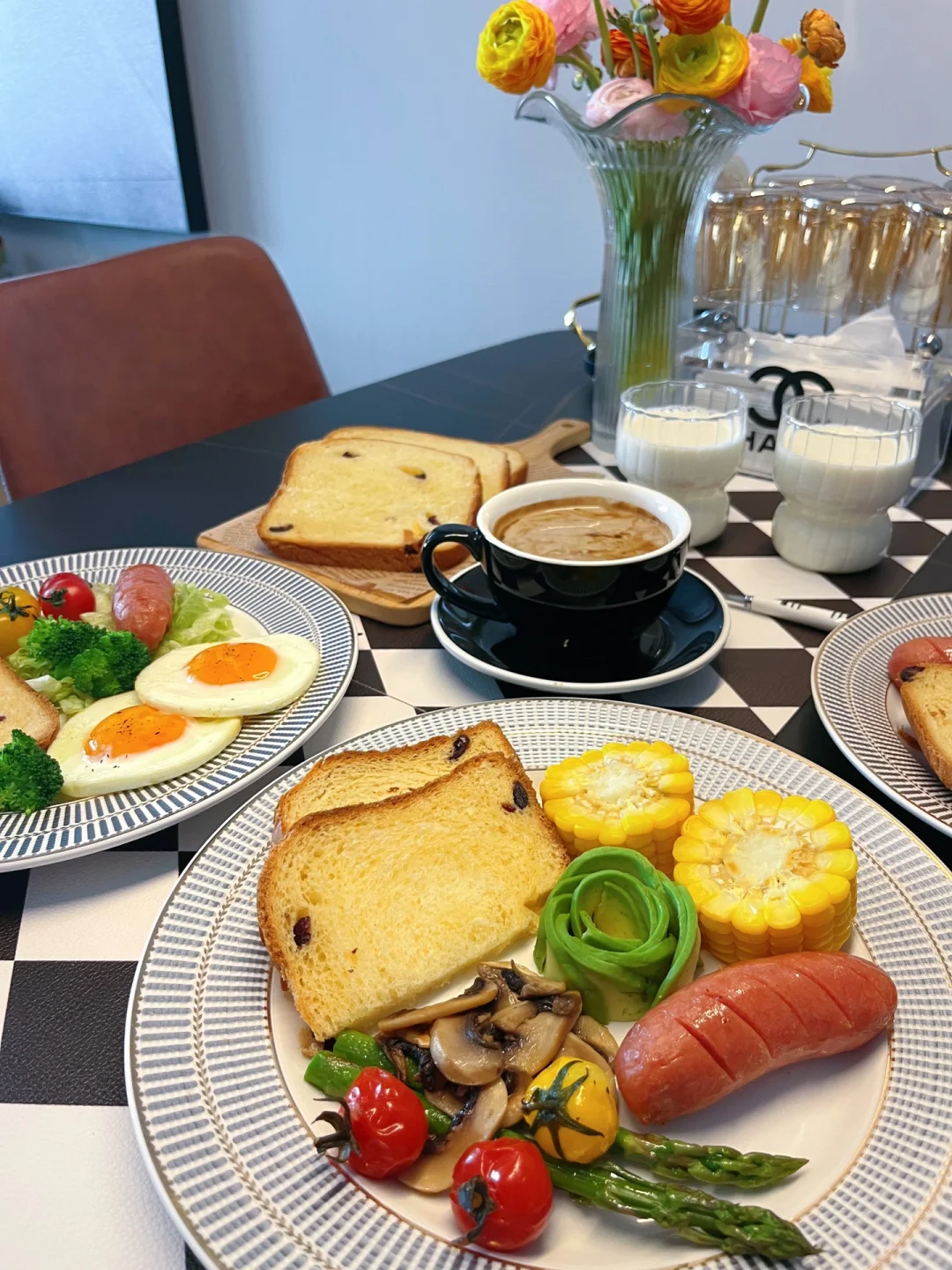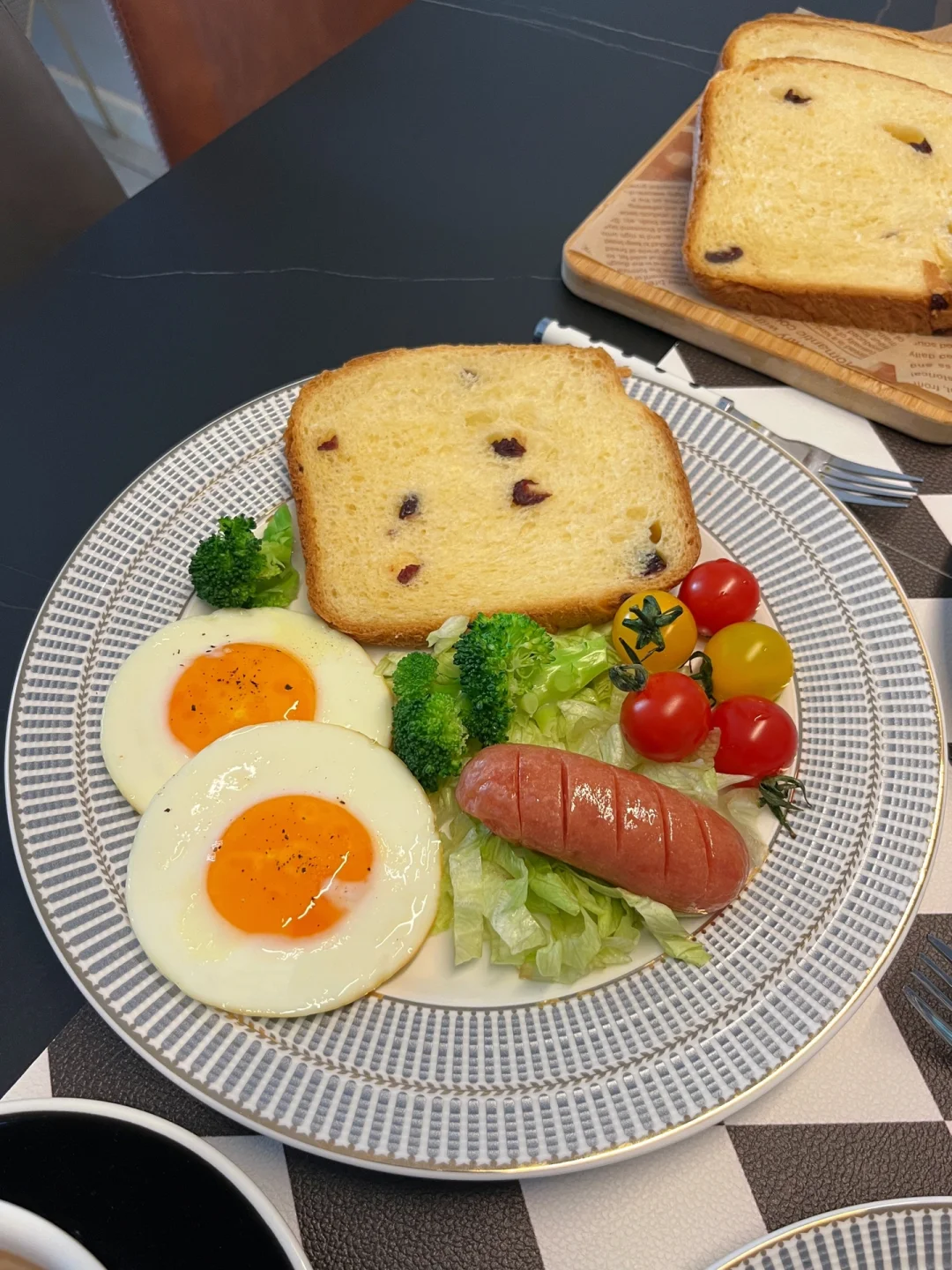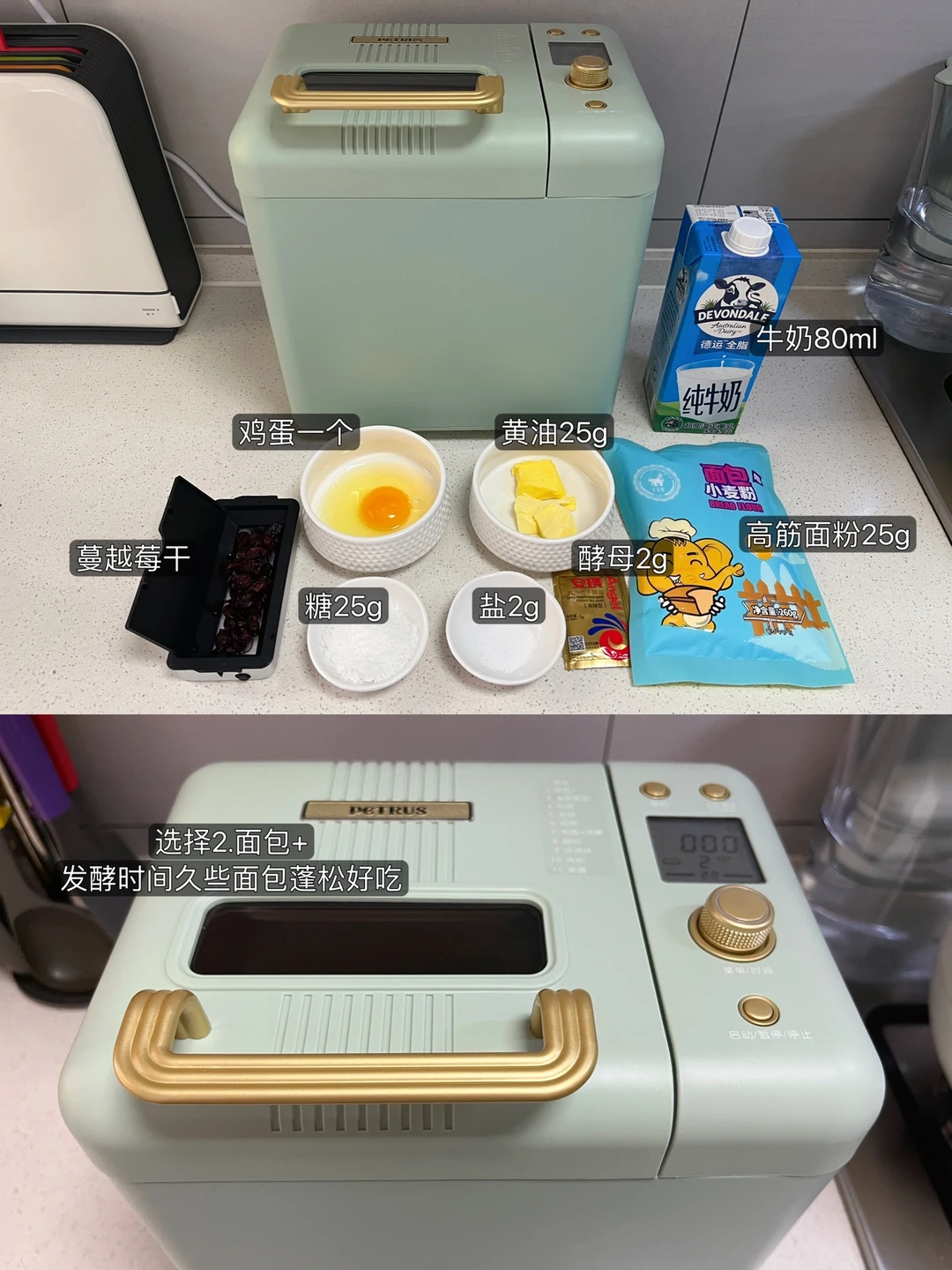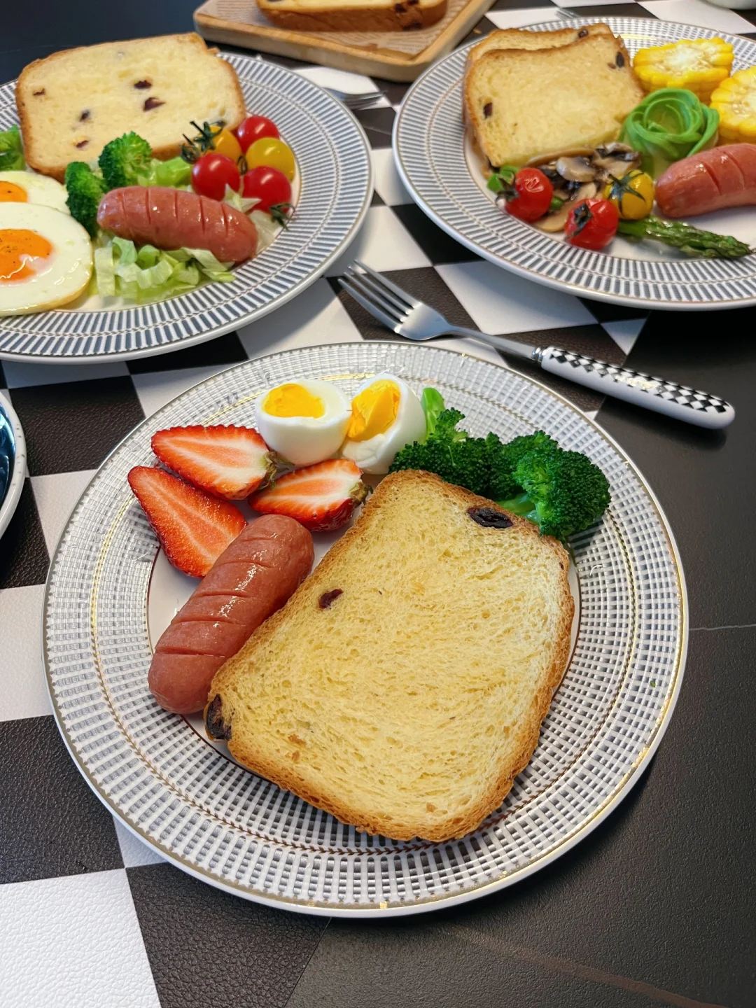 精致的早餐 能让一天的能量满满!最近虽然没有常更新早餐,但是每天都有认真吃~ 而且早餐一定要吃的好呀,只有营养均衡了,身体才会棒棒~ 我老公不太喜欢吃玉米,儿子必须吃草莓,所以能看出来一家三口谁负责吃哪盘嘛~ 最近我家常用的面包机忍不住要分享给你们,懒人一键操作,烤出来的面包满屋飘香全家人都喜欢 我今天做的是蔓越莓吐司👇🏻 ………………………… 🍞准备食材: 牛奶80ml,黄油25g,盐2g,鸡蛋一个,糖25g,高筋面粉220g,酵母粉2g 步骤: 1️⃣先放入牛奶,鸡蛋,黄油 2️⃣再倒糖,盐,高筋面粉,酵母 3️⃣将蔓越莓放入果料盒插入面包机,根据时间会自动撒料 4️⃣盖上盖子选择你要做的面包模式就不用关啦~时间到了自动进入保温模式~ 香喷喷软绵绵的吐司切片,再配上喜欢的各种食材,早餐就搞定啦~