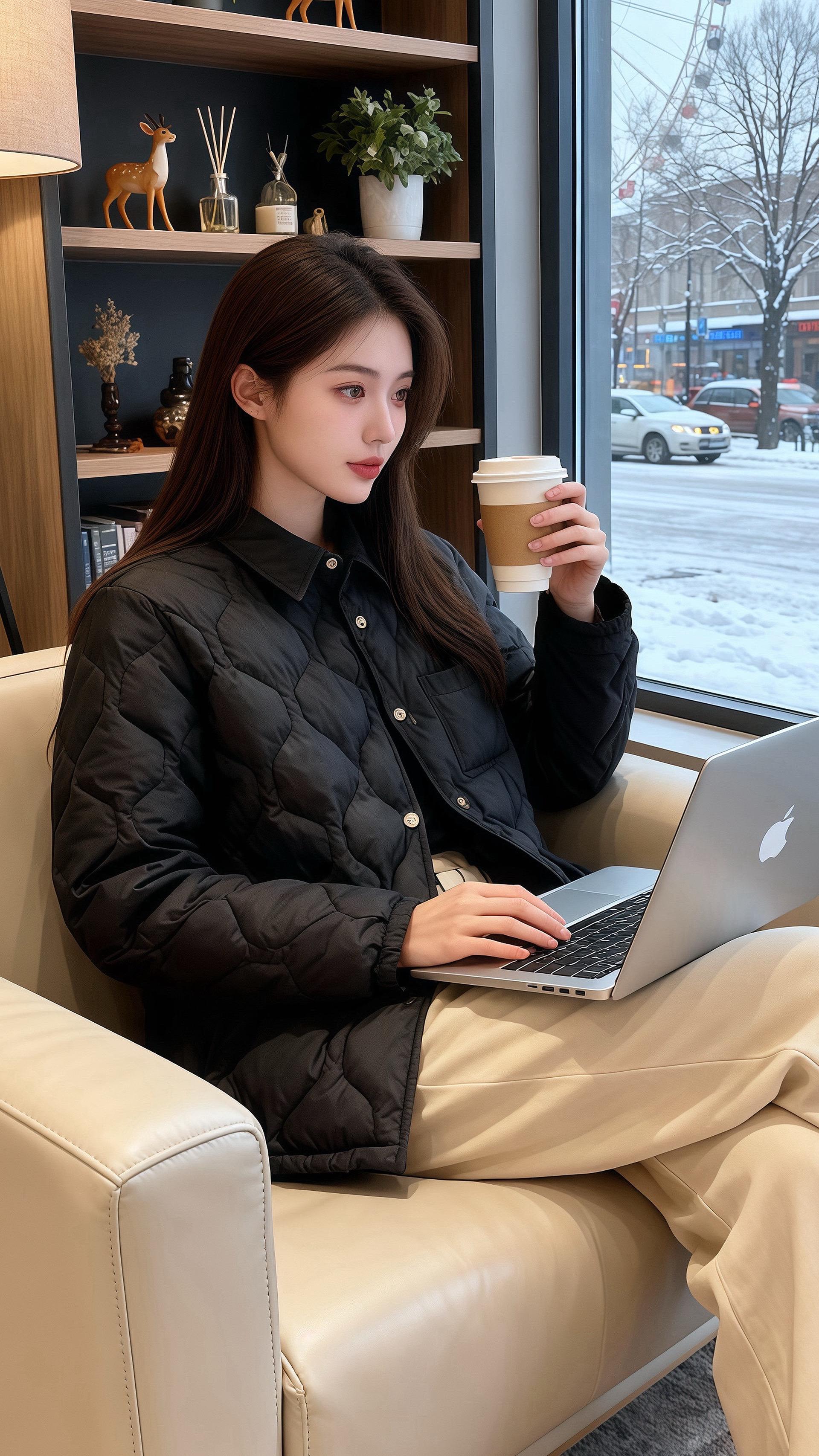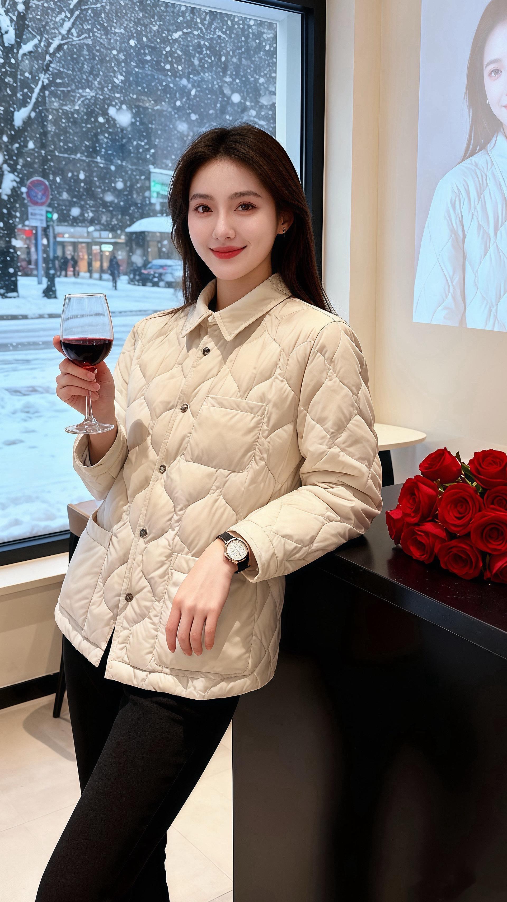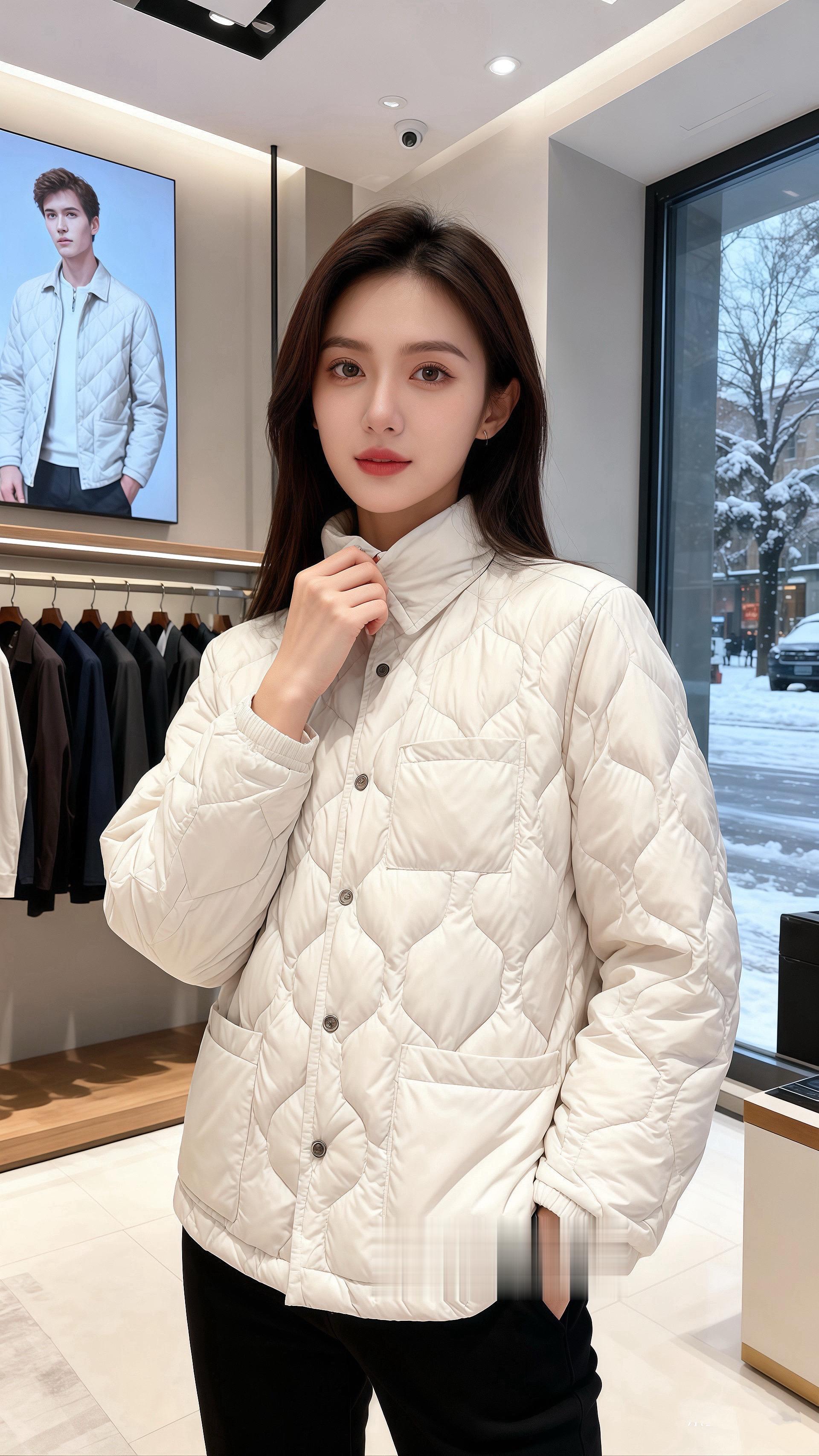 雪落的傍晚,林晚在男装店试米白菱格棉服,指尖碰领口时,撞进沈则的视线——他是来取定制西装的,却盯着她的衣摆口袋发愣:“这版型衬得你肩线很柔和,像把冬风都裹软了。” 后来她穿黑色款窝在咖啡馆敲字,沈则端热拿铁坐下:“黑款比米白利落,配奶杏裤像把雪天的光都揉进穿搭里了。”玻璃外摩天轮转着,他指尖碰过她的袖口,弧度恰好裹住腕骨。 初雪那天,她穿回米白款在落地窗前捧红酒,沈则从身后轻碰杯沿:“还是这个颜色衬你,像把所有温和的日子都缝在了衣摆里。”窗外雪片落得急,他的吻落在她颈侧,恰好是棉服领口露出的软绒处——原