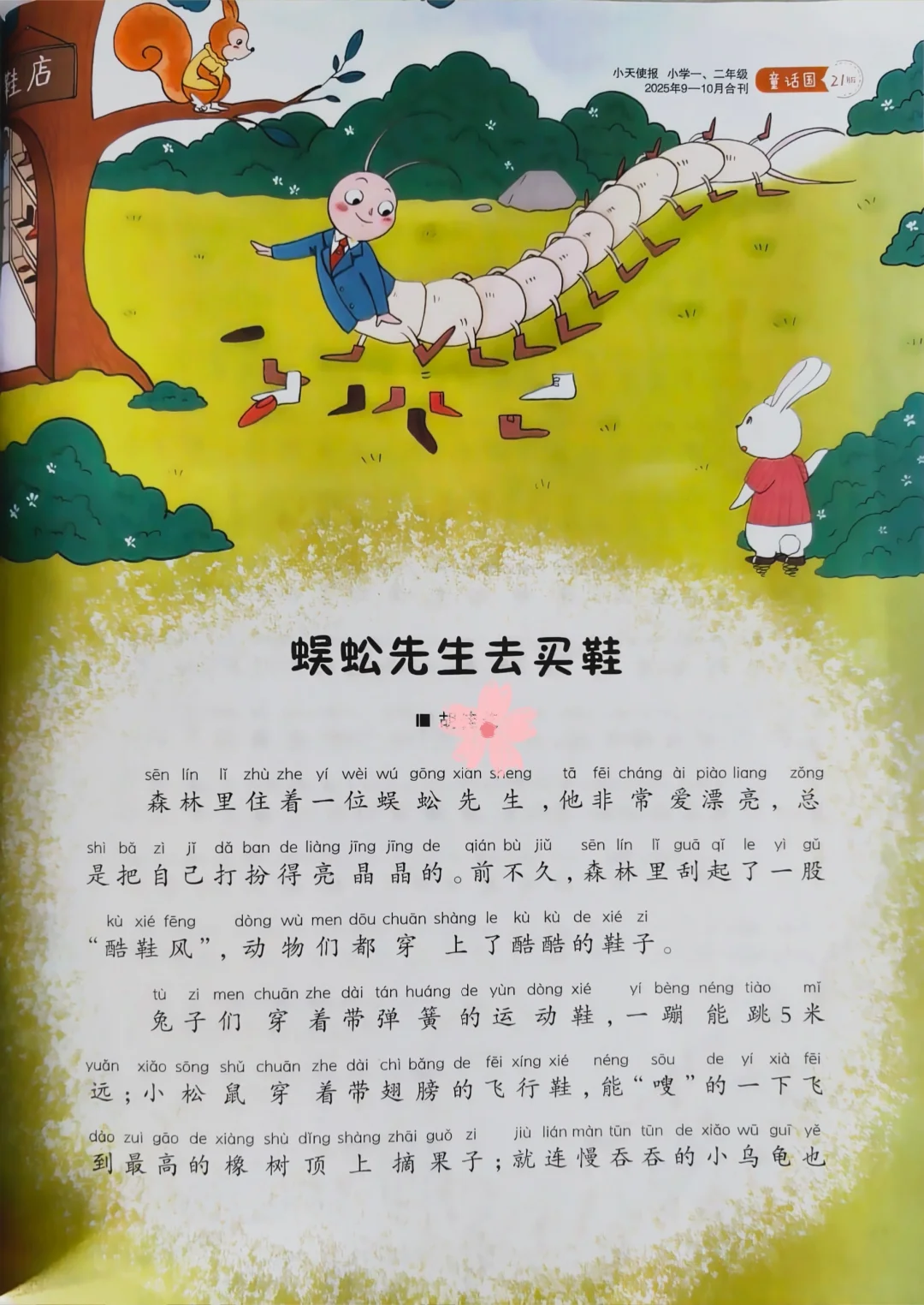 收到《小天使报》杂志样刊了,超级激动[哭惹R][哭惹R]。 这篇童话从投稿到收稿通知,再到排版、印刷、最后拿到样刊,这个过程有4个月左右,周期相比成人报刊杂志长很多。 . 👉等待的时间不要浪费 与其每天焦虑地等消息,不如继续写新的故事。我就是在等样刊的这几个月里,又完成了3篇新作品,并且也都发表了![偷笑R][偷笑R][偷笑R] . 👉说起这篇《小蜈蚣穿鞋》的灵感来源,真的特别有意思!有一天在家里看到了一只蜈蚣,密密麻麻的小脚丫在地上爬来爬去。我突然脑洞大开:"这么多脚,如果她去买鞋子会怎么样?" . 👉就是这么一个简单的念头,让我一下子找到了故事的切入点!我想写一个关于"寻找适合自己的生活方式"的主题——就像小蜈蚣要找到适合自己一百只脚的鞋子一样,每个人也需要找到属于自己的生活节奏 . 🌿我总结的童话创作小技巧 其实写童话其实没那么难,关键是要掌握几个核心方法: 1⃣从日常生活中捕捉灵感 童话的种子就藏在我们的日常里!一只蜈蚣、一片落叶、一颗星星...都可能变成故事的主角。建议大家养成童话眼的习惯--看到任何事物都问自己如果它会说话/有情感会怎样?这种观察力是可以训练的哦‼️ . 2⃣用如果开启无限想象 我的创作秘诀就是不断问自己“如果会怎样……” 如果星星掉下来? 如果玩具在夜里活过来? 这个如果就像一把钥匙,能打开童话世界的大门。每次卡文的时候,我就会用这个方法重新激发灵感 。 . 3⃣好的童话不只是好玩,还要传递一些温暖的力量。我这篇写的是“找到适合自己的生活方式”,其实就是想告诉小朋友(也告诉自己):不用和别人比较,找到属于你的节奏就好主题可以是:勇敢、友谊、接纳自己、保护环境.但记得要用故事去呈现,而不是生硬说教哦! . 👧我是纯粹,自由撰稿人,儿童文学爱好者。 梦想出版属于自己的散文集和童话故事集