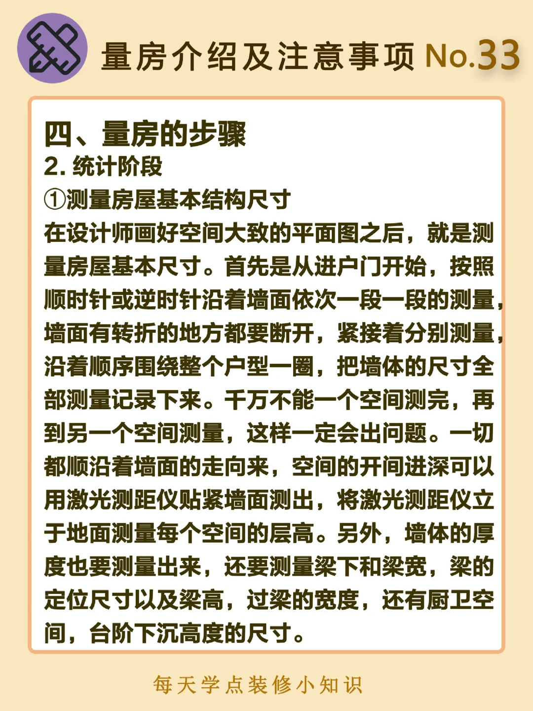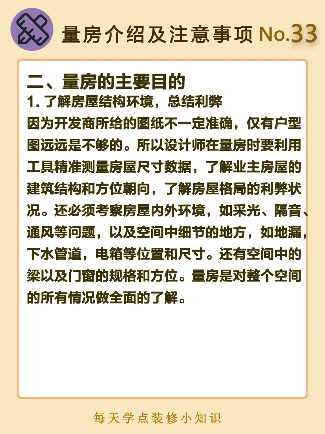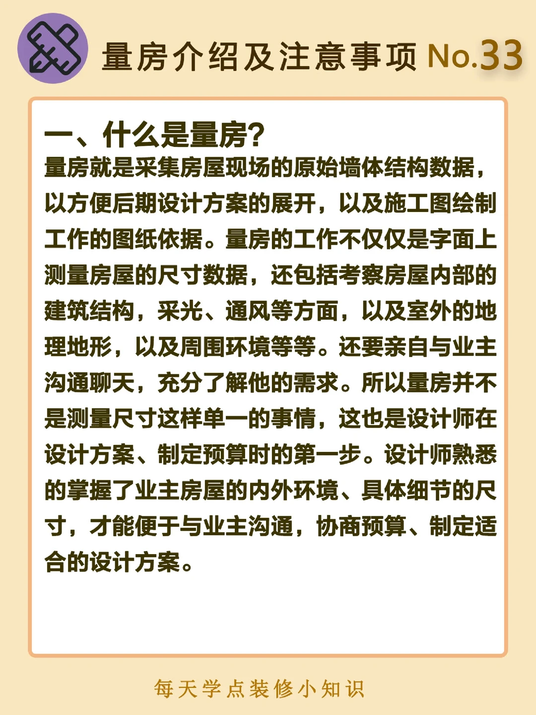 量房就是采集房屋现场的原始墙体结构数据,以方便后期设计方案的展开,以及施工图绘制工作的图纸依据。量房的工作不仅仅是字面上测量房屋的尺寸数据,还包括考察房屋内部的建筑结构,采光、通风等方面,以及室外的地理地形,以及周围环境等等。还要亲自与业主沟通聊天,充分了解他的需求。所以量房并不是测量尺寸这样单一的事情,这也是设计师在设计方案、制定预算时的第一步。设计师熟悉的掌握了业主房屋的内外环境、具体细节的尺寸,才能便于与业主沟通,协商预算、制定适合的设计方案。