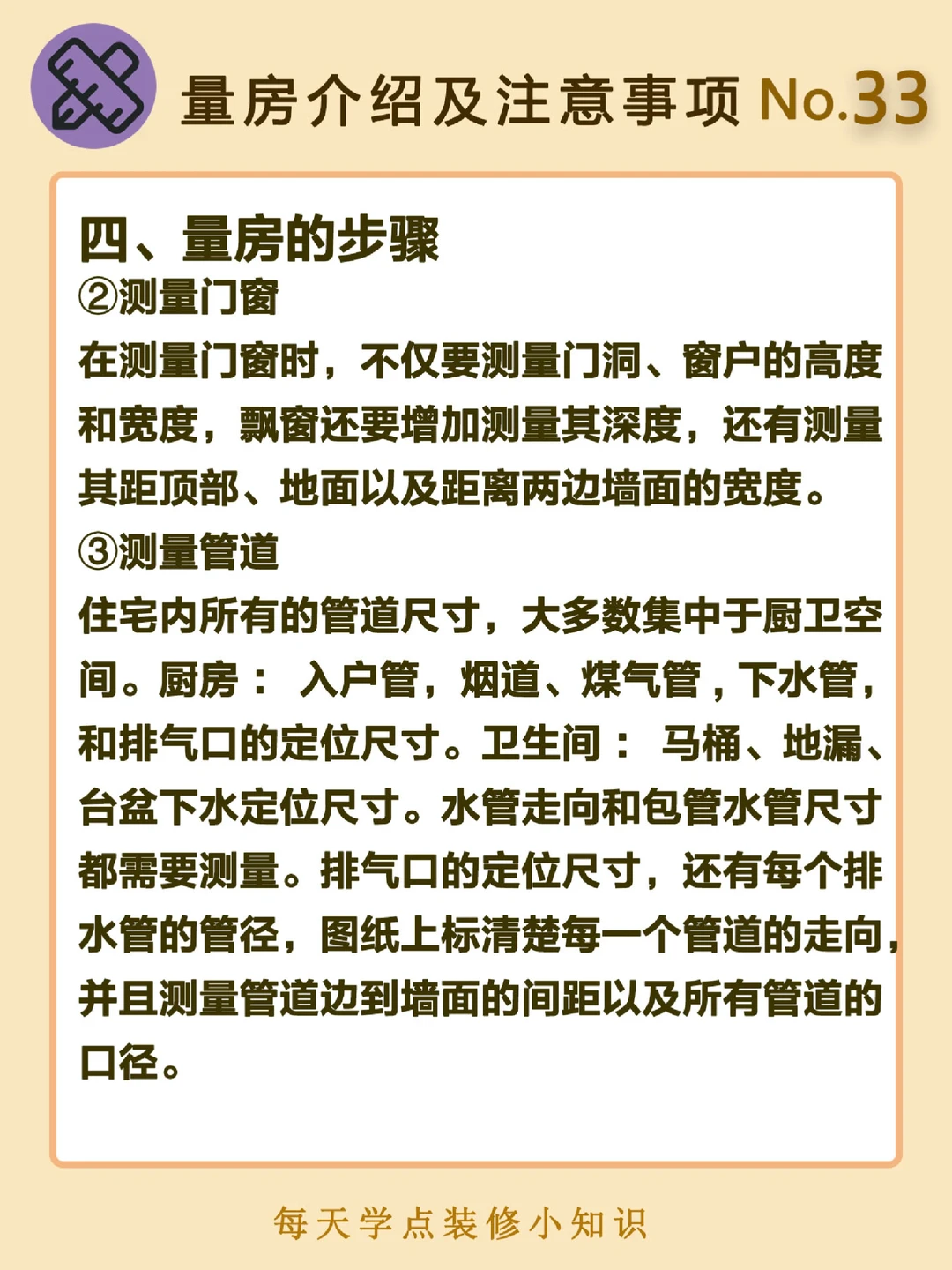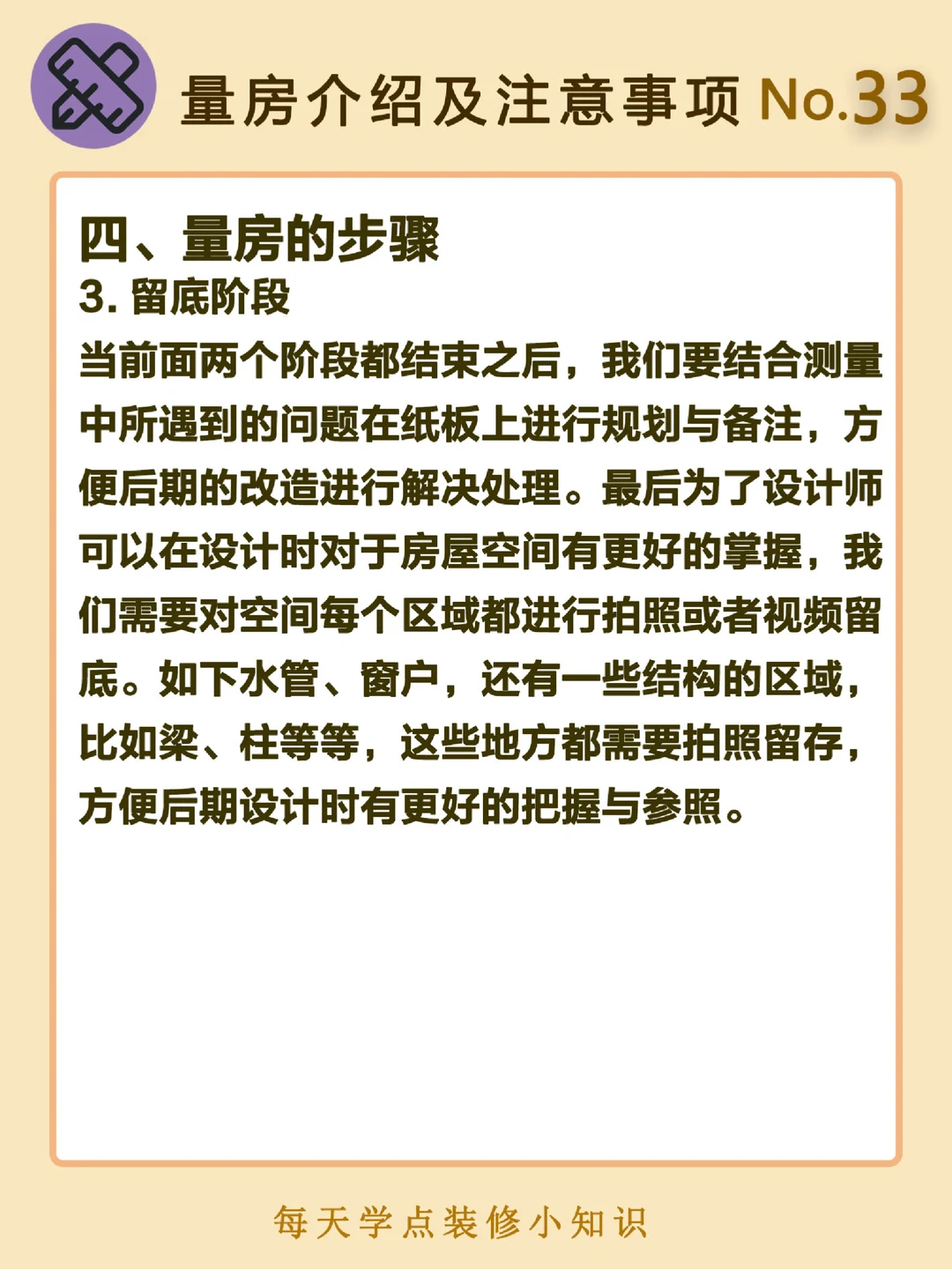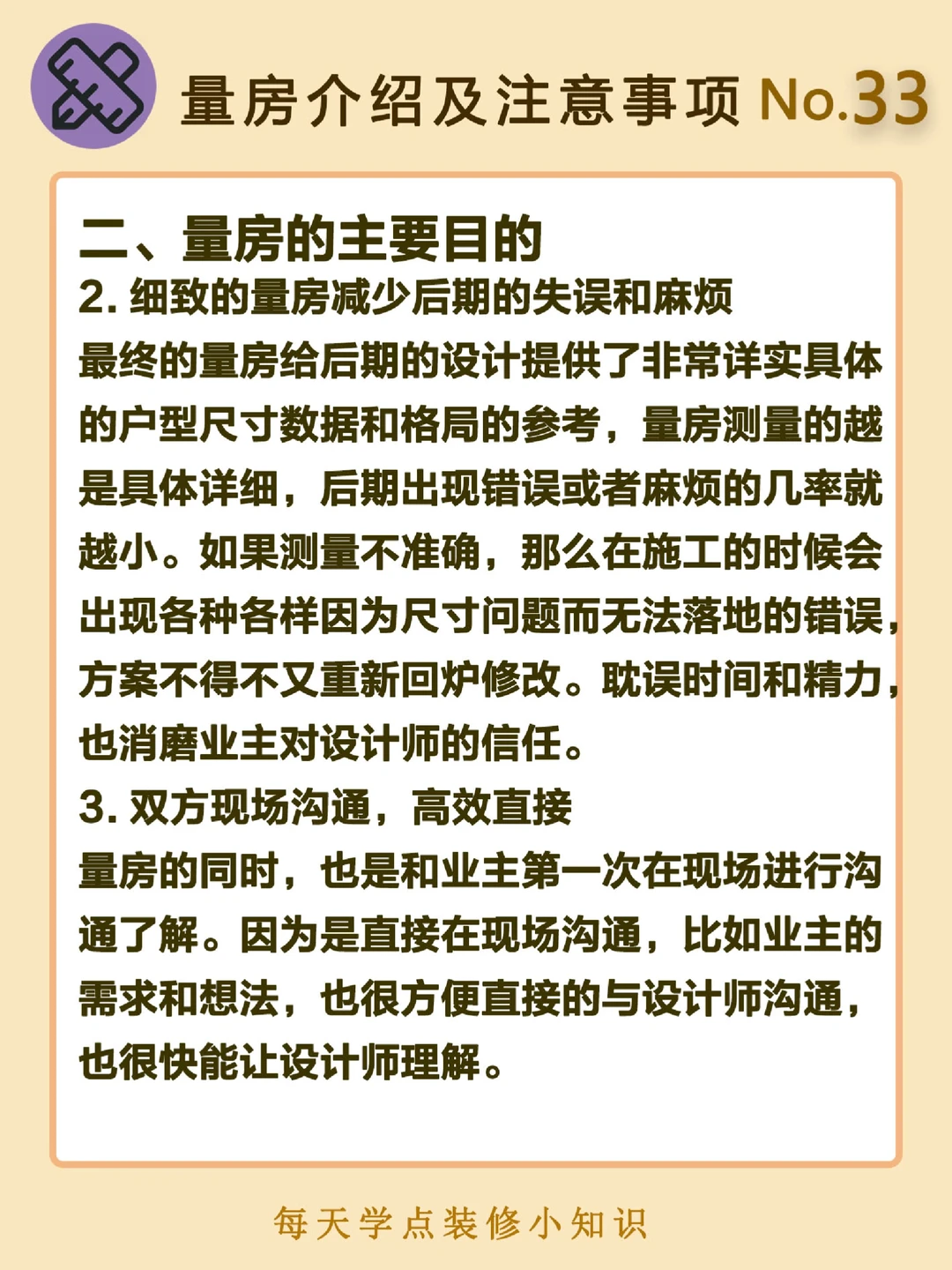 量房就是采集房屋现场的原始墙体结构数据,以方便后期设计方案的展开,以及施工图绘制工作的图纸依据。量房的工作不仅仅是字面上测量房屋的尺寸数据,还包括考察房屋内部的建筑结构,采光、通风等方面,以及室外的地理地形,以及周围环境等等。还要亲自与业主沟通聊天,充分了解他的需求。所以量房并不是测量尺寸这样单一的事情,这也是设计师在设计方案、制定预算时的第一步。设计师熟悉的掌握了业主房屋的内外环境、具体细节的尺寸,才能便于与业主沟通,协商预算、制定适合的设计方案。
