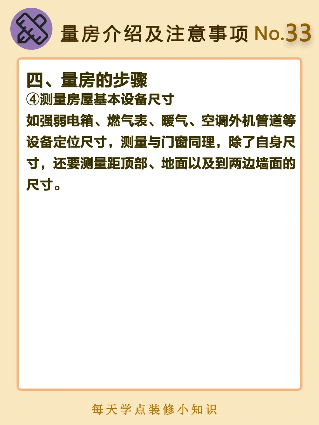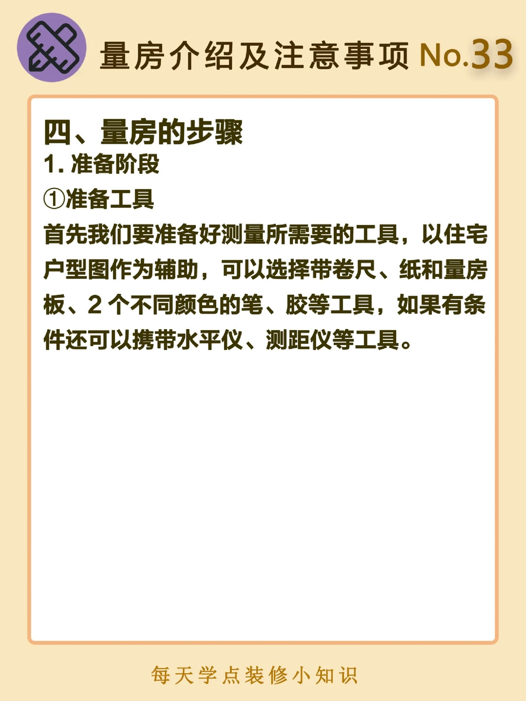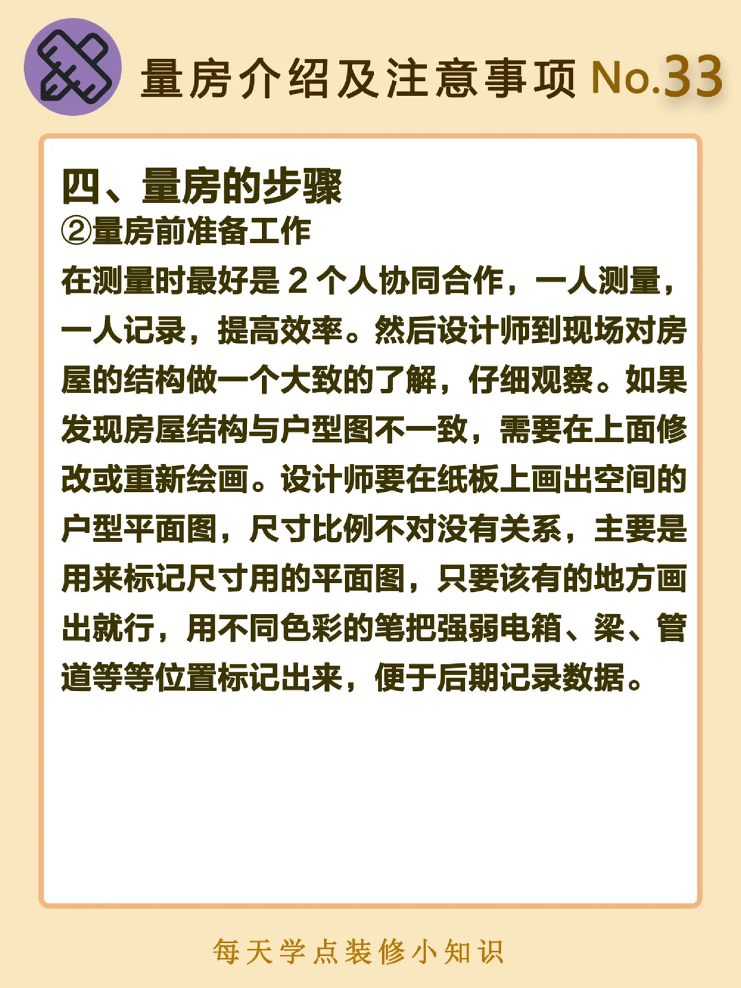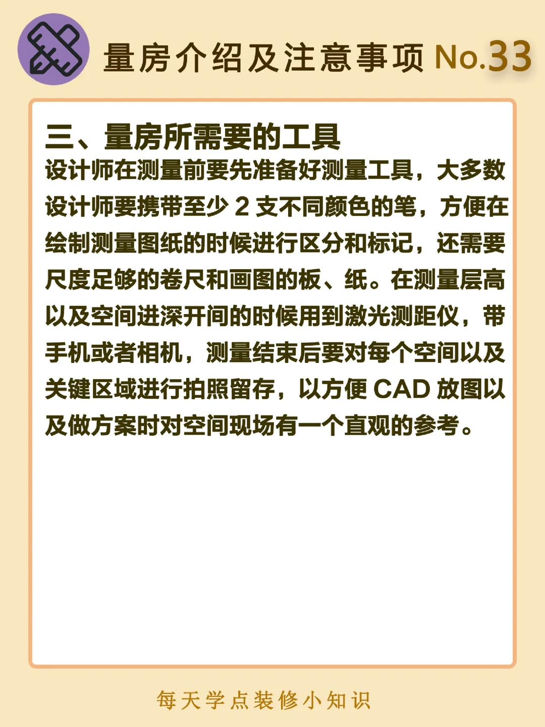 设计师在测量前要先准备好测量工具,大多数设计师要携带至少2支不同颜色的笔,方便在绘制测量图纸的时候进行区分和标记,还需要尺度足够的卷尺和画图的板、纸。在测量层高以及空间进深开间的时候用到激光测距仪,带手机或者相机,测量结束后要对每个空间以及关键区域进行拍照留存,以方便CAD放图以及做方案时对空间现场有一个直观的参考。
