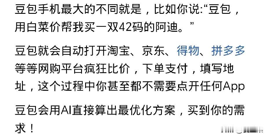 太可怕了, 豆包手机深入智能化惹人争议, 比如说你想买一件性价比最高的商品,你告诉豆包手机,它就会自动比较多多,京东,淘宝,等各大电商平台进行挑选,挑选后自动下单填写收货地址自动付账。 中间不需要你打开任何一个电商平台。 假如有人命令你的这个豆包手机,将你银行卡内的钱转走,那也是可以实现的, 所以,这是隐患,严重的金融安全隐患。 所以12月1日出了这款手机,12月5日官方就声明,将对豆包手机在金融、刷分等方面限制使用。