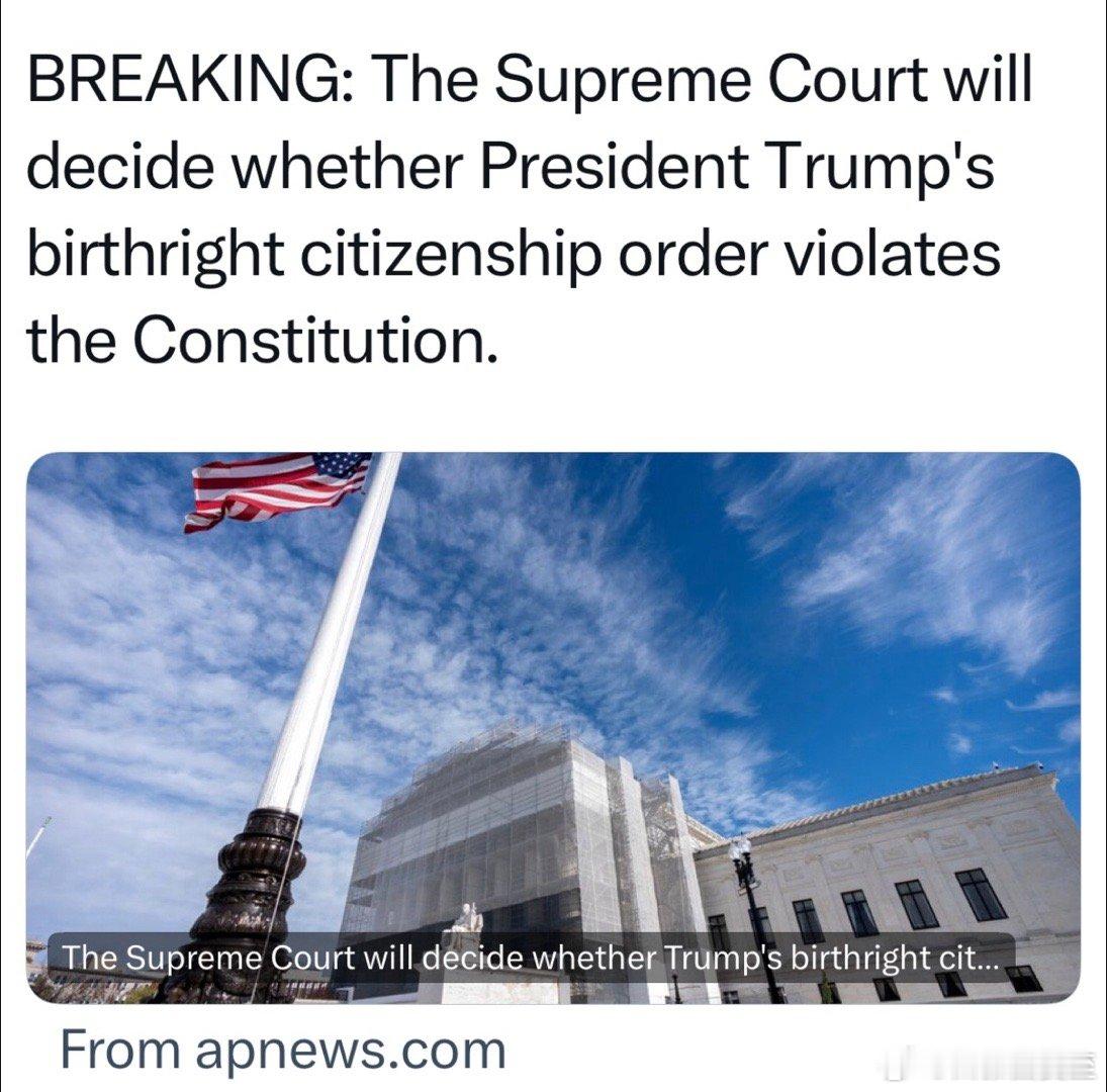 美国最高法,今天同意审理,本届政府取消“出生即有公民权”的案件预计明年春天、或初夏,能出最终裁决主要影响出生时,父母没有在美合法身份、或只有短期签证的人