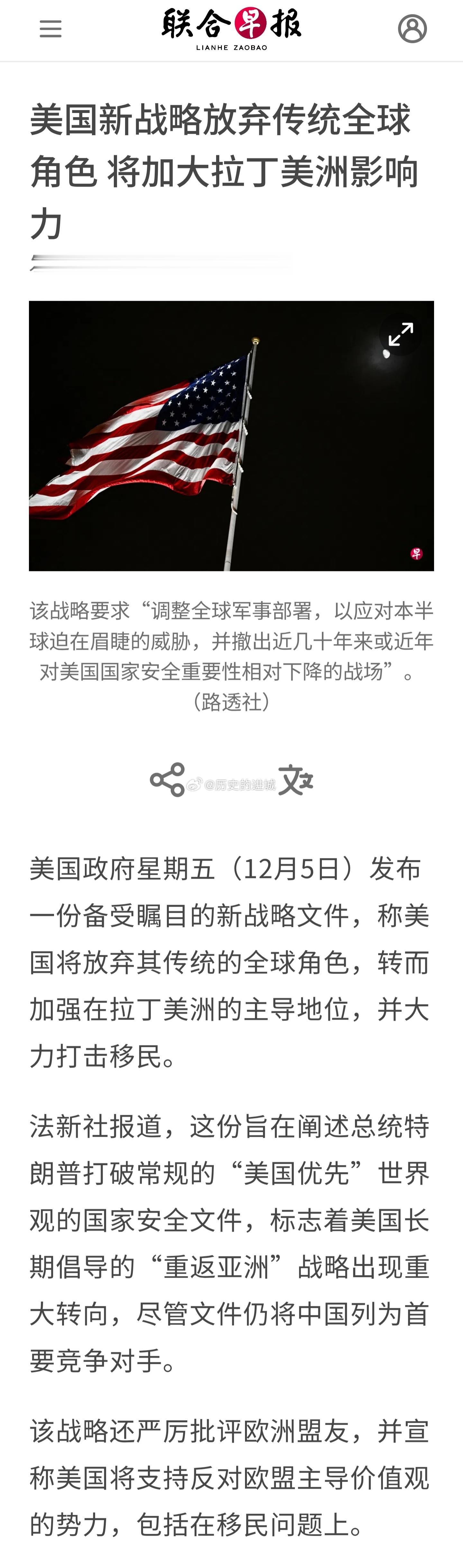 美国政府星期五(12月5日)发布一份备受瞩目的新版国安战略文件,称美国将放弃其传统的全球角色,转而加强在拉丁美洲的主导地位,并大力打击移民。该战略要求“调整全球军事部署,以应对本半球迫在眉睫的威胁,并撤出近几十年来或近年对美国国家安全重要性相对下降的战场”。据报道,这份旨在阐述总统特朗普打破常规的“美国优先”世界观的国家安全文件,标志着美国长期倡导的“重返亚洲”战略出现重大转向。该战略还严厉批评欧洲盟友,并宣称美国将支持反对欧盟主导价值观的势力,包括在移民问题上。该战略打破了美国数十年来追求成为唯一超级大国的尝试,称“美国拒绝了以自身为主导的、注定失败的全球霸权理念”。文件说,美国将阻止其他大国称霸,但补充道:“这不意味着要耗费血汗钱财来遏制全球所有大国和中等强国的影响力。”该战略以强硬的措辞强调美国在拉丁美洲的主导地位。特朗普政府一直在拉丁美洲打击海上毒品走私活动,干预局势以推翻包括委内瑞拉在内的左翼领导人,并高调寻求控制巴拿马运河等关键资源。该战略将特朗普塑造成对拥有两百年历史的门罗主义进行现代化的推手——当年年轻的美国曾宣布拉丁美洲为欧洲等竞争大国的禁区。“我们将提出并执行门罗主义的‘特朗普推论’。”