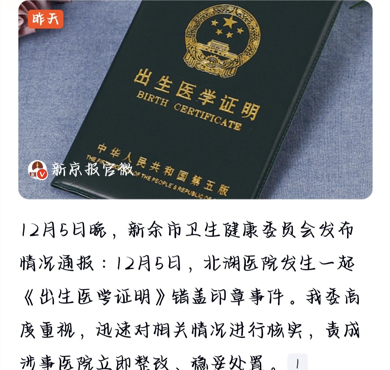 新余北湖医院这次《出生医学证明》错盖死亡章的乌龙事件,真是让人哭笑不得又后怕。新生儿的第一份“人生档案”竟被盖错章,家长心里得多膈应啊!好在今年卫健委反应够快,医院也麻溜道歉、处理责任人,总算平息了风波。不过细想挺瘆人——出生证明涉及落户、身份等大事,流程管理竟能出这种低级错误,到底是系统漏洞还是工作人员马虎?现在很多地方都推行电子化签发和人脸核验了,比如成都要求签发时必须双人核对、全程录像,看来传统纸质盖章模式真得跟上时代了。希望这次教训能让医院长点心,别再让“盖错章”这种黑色幽默伤了老百姓的心。医院证明 出生证姓名 开医院证明