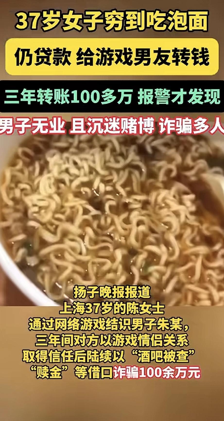 37岁的陈女士平时省到吃泡面,却三年里给网上认识的“游戏男友”转了一百多万。对方用各种借口骗钱,什么“酒吧被查要赎金”都编得出来。 她一直以为在谈恋爱,直到报警才发现,那个男的无业还沉迷赌博,用同样手段骗了好多人。 自己过得紧巴巴,钱却全给了骗子,真是又气又心疼。网络交友千万要清醒,没见过面就让你不停转钱的,十有八九有问题。别让“感情”蒙住了眼睛。