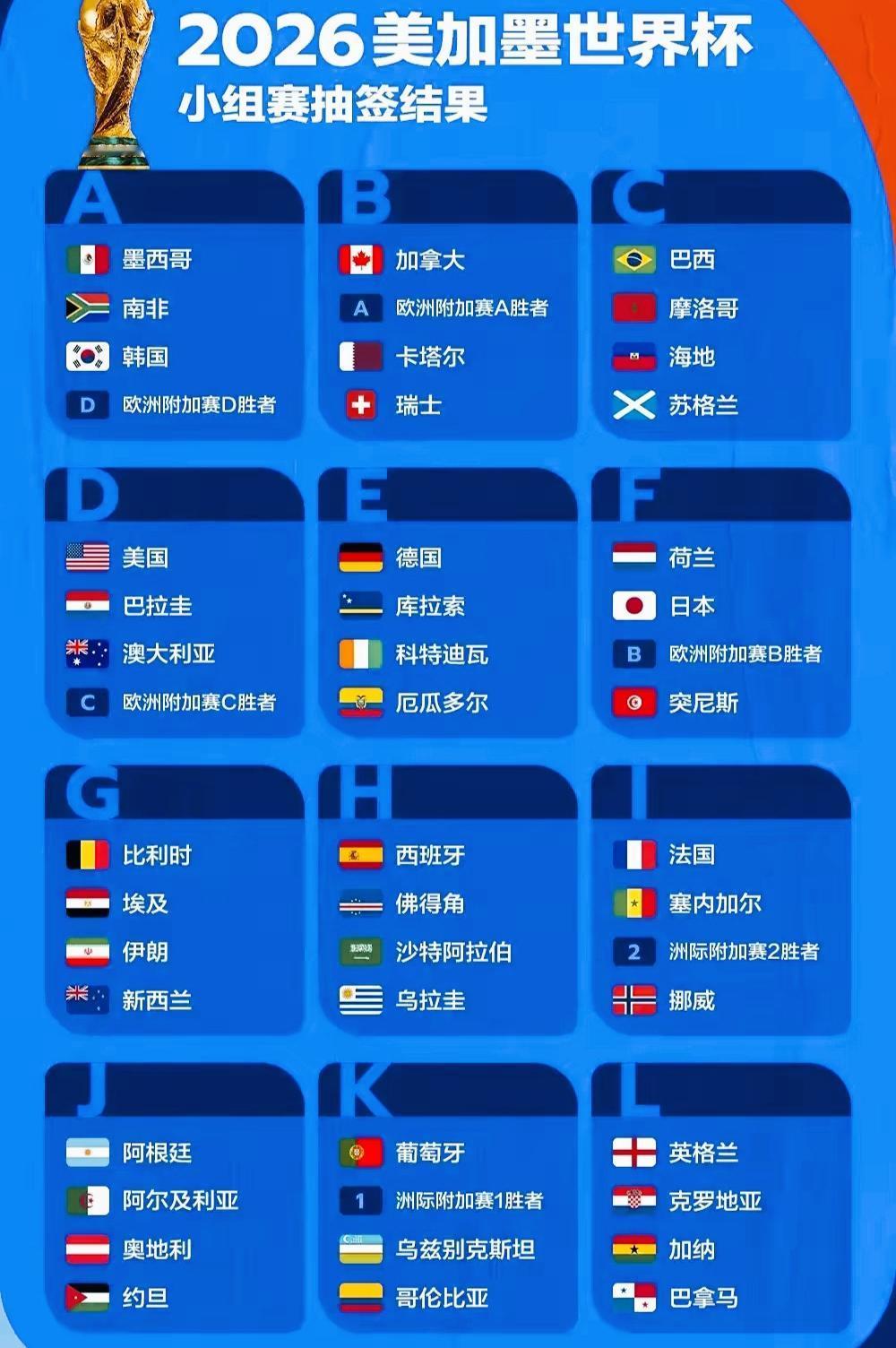 2026美加墨世界杯分组,是不是几家欢喜几家愁啊? 传统强队对于分组是不是还比较满意啊? 三个东道主对于抽签不知感觉如何啊? 能顺利的小组出线吗? 小组赛的看点之一,应该就是姆巴佩和哈兰德之间的碰撞吧?