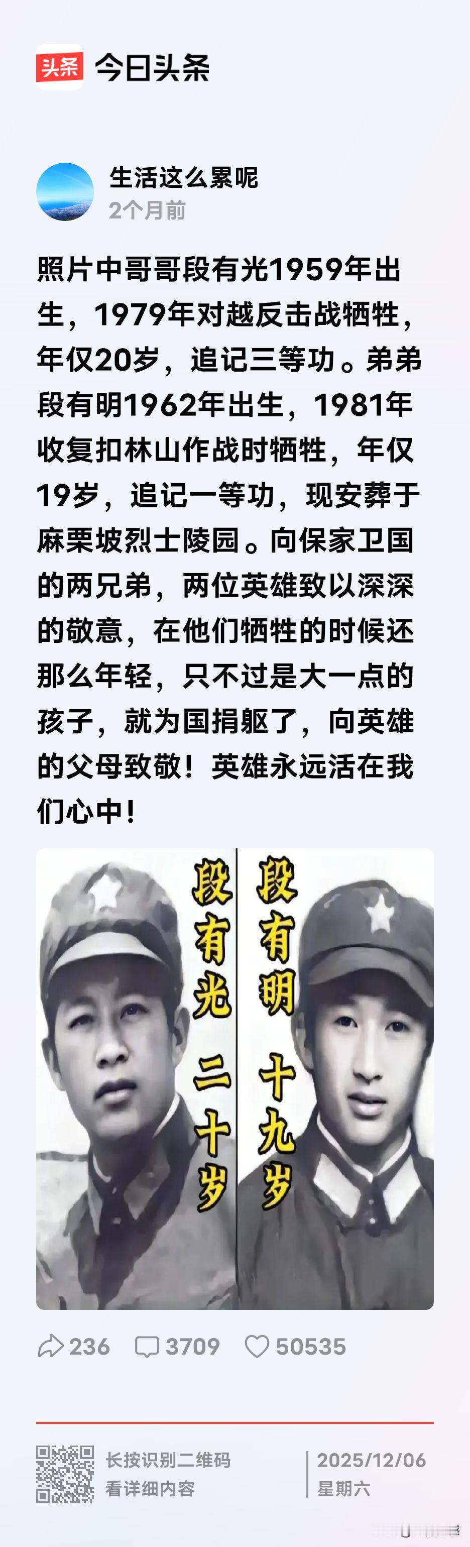 烈士兄弟,让人泪目!照片中的这两个人,是一对一奶同胞的亲兄弟,两个人年龄相差三岁,先后为国捐躯,哥哥牺牲的时候20岁,弟弟牺牲的时候19岁,兄弟二人先后壮烈牺牲在战场上,这对他们的父母和家人来说,两年时间,痛失二子,痛失两位亲人。这兄弟二人是英雄,他们的父母是英雄的父母,发自内心的向英雄致敬,让他们的父母致敬!
