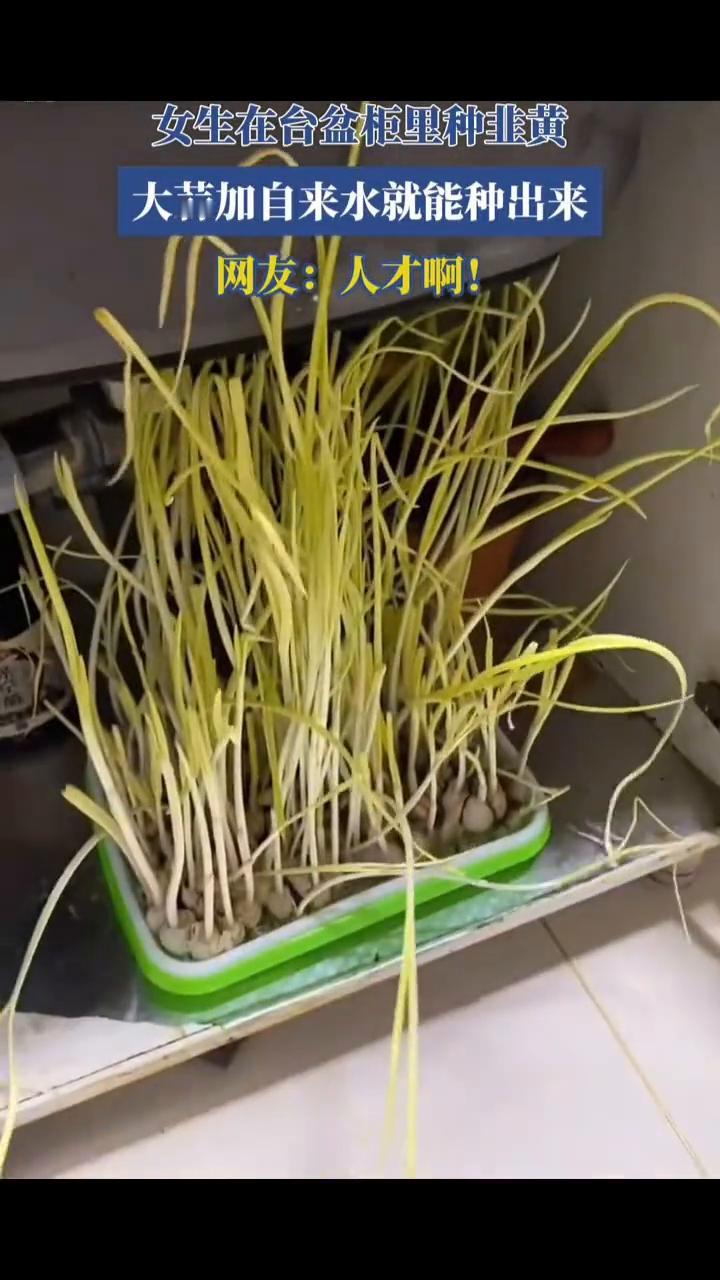 女生在台盆柜里种韭黄,大蒜加自来水就能种出来。网友:人才啊!