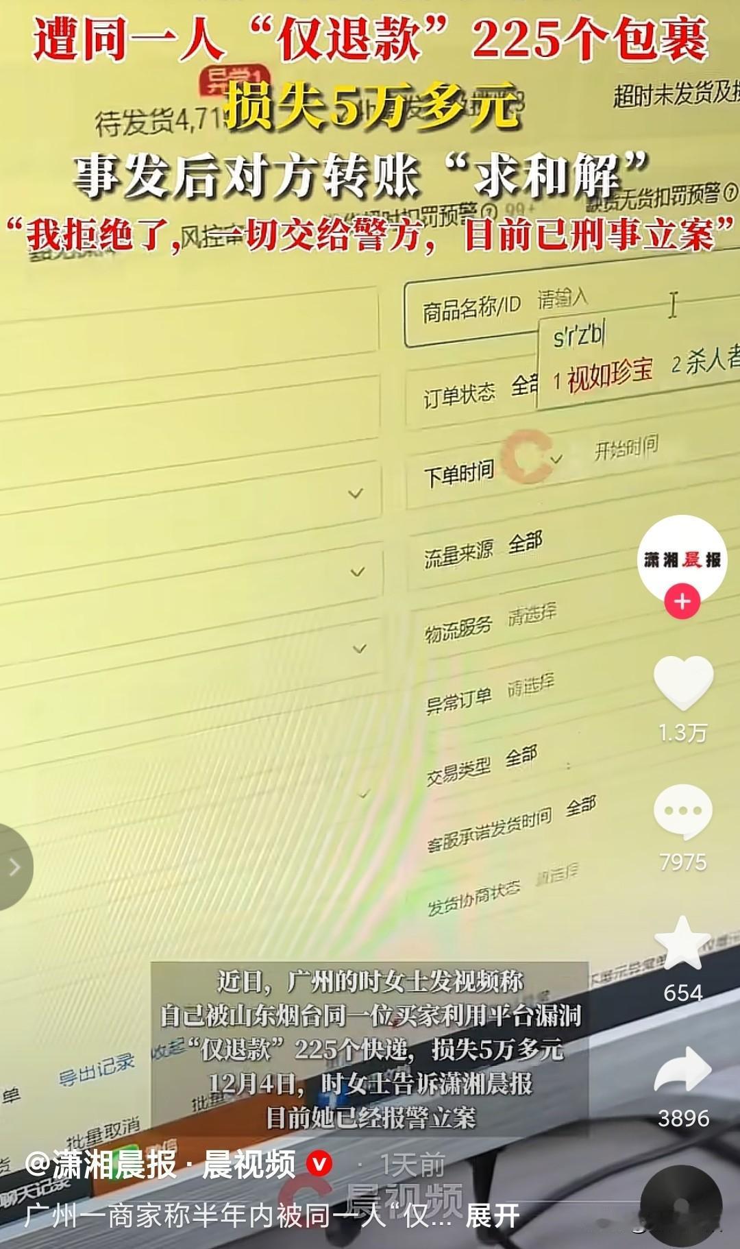 “胆子太大了!”,广东一位商家半年内被同一名女生“仅退款”225件包裹,直接损失高达57000多。 据商家说,第一次收到对方退款申请时没多想,以为是正常的商品问题,按平台规则处理了退款。可没想到,这只是开始,接下来的半年里,对方频繁下单,小到几十块的日用品,大到上百元的服饰,几乎每单收到货后都会以“质量问题”“货不对板”为由申请仅退款,且拒绝退回商品。 一开始商家还尝试沟通,让对方提供问题凭证,可对方要么敷衍回复,要么直接发起平台介入。次数多了,商家才发现不对劲,翻查订单记录才发现,半年时间里,仅这一名女生就发起了225次仅退款,涉及订单金额加起来有57000多块,相当于小半年的净利润全打了水漂。 商家无奈吐槽,自己做的是小本生意,每件商品利润微薄,对方这样“只拿东西不花钱”的操作,简直是把平台规则当成了牟利工具。 为了维权,他整理了所有订单记录、沟通截图,多次向平台反馈,可每次都只得到“按现有规则处理”的回复,对方的账号依然能正常下单退款。 视频发酵后,网友吵翻了天。有网友觉得,女生这明显是恶意薅羊毛,利用仅退款规则钻空子,完全是不劳而获,根本没把商家的付出当回事,太不道德;也有网友说,会不会是商品真的有问题,不然对方怎么敢多次申请仅退款? 但我觉得,商家靠诚信经营赚钱,平台设置仅退款规则是为了保障消费者权益,而不是给别有用心的人提供牟利渠道。 225次仅退款、57000多块损失,还不算每次快递、人工的费用,这已经不是正常的消费纠纷,而是主观方面的损害商家利益。 商家保留了证据、积极沟通,看得出来也想合理解决问题,可这样的遭遇实在让人揪心,商家凭本事赚钱、守规矩经营,凭什么要为别人的贪心买单?