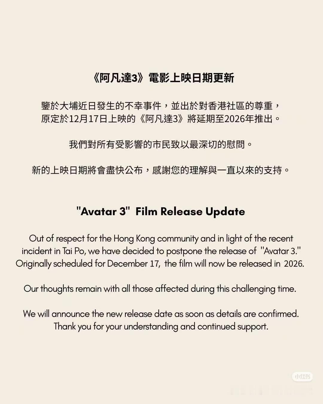 【阿凡达3香港地区延期上映】12月6日,20世纪影业发布消息,因香港大埔宏福苑火灾,电影《阿凡达3》中国香港地区将延期上映,声明也省去了该片副标题“火与烬”。“鉴于大埔近日发生的不幸事件,并出于对香港社区的尊重,原定于12月17日上映的《阿凡达3》将延期至2026年推出。”