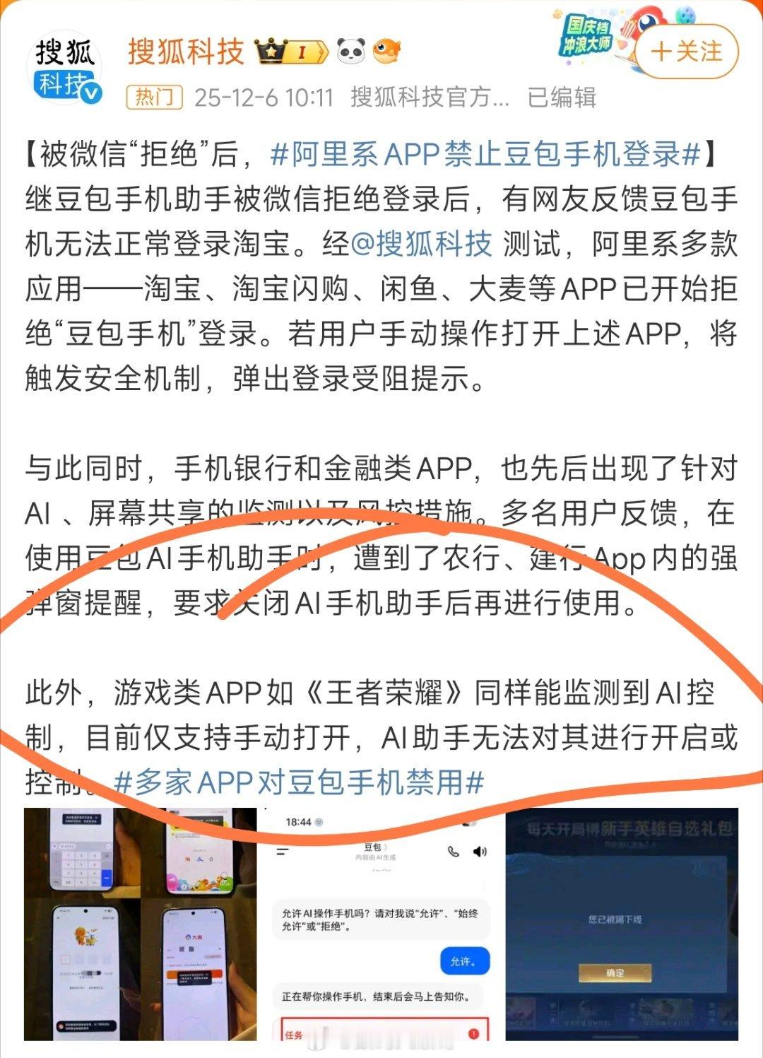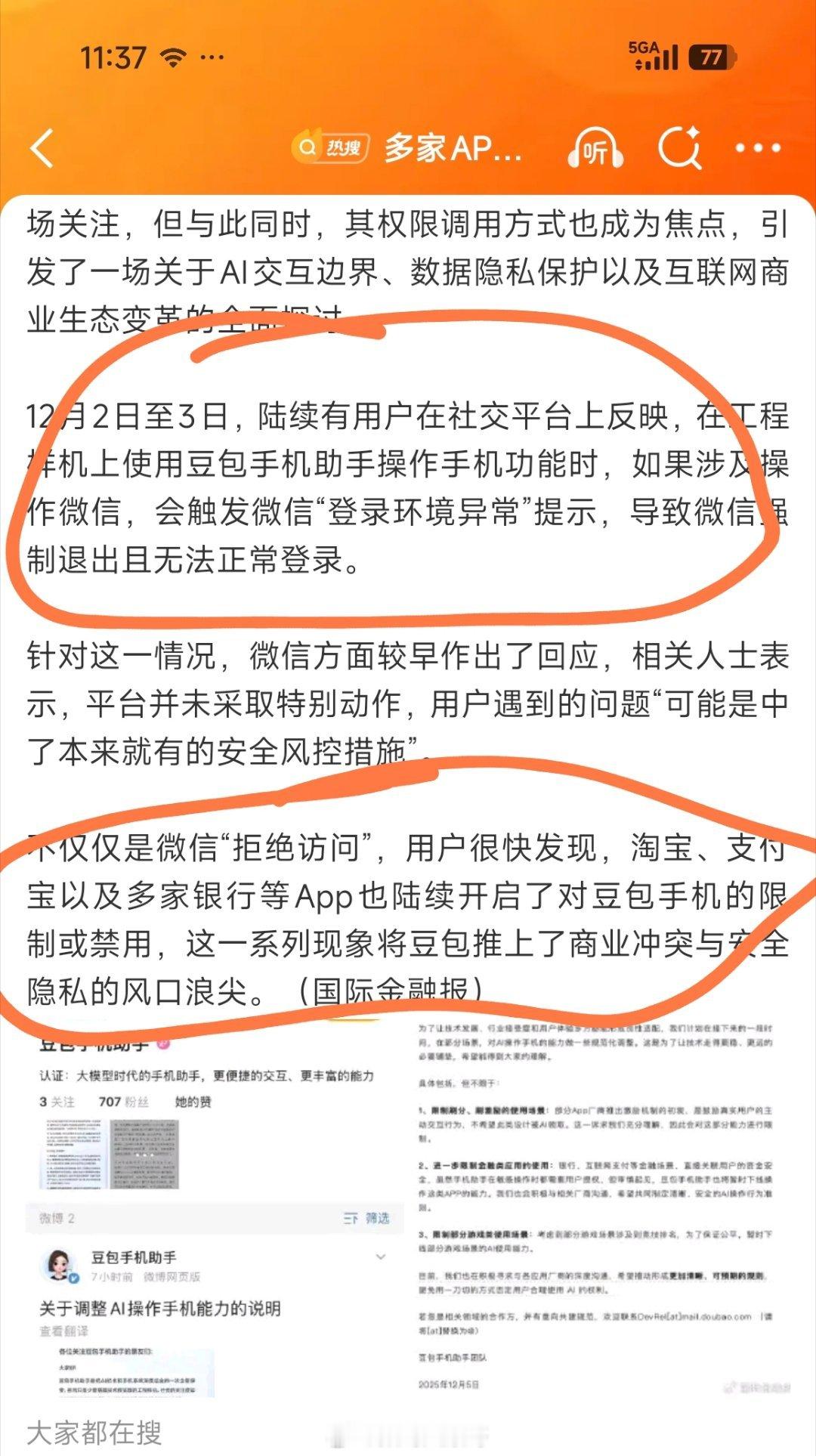 多家APP对豆包手机禁用完了完了,豆包手机这是被巨头联合拿捏了吗?微信刚拒登,阿里系直接一锅端,淘宝、支付宝全用不了,银行app对豆包手机限制或禁用,王者还禁AI控制,豆包手机这是捅了APP窝了吗?