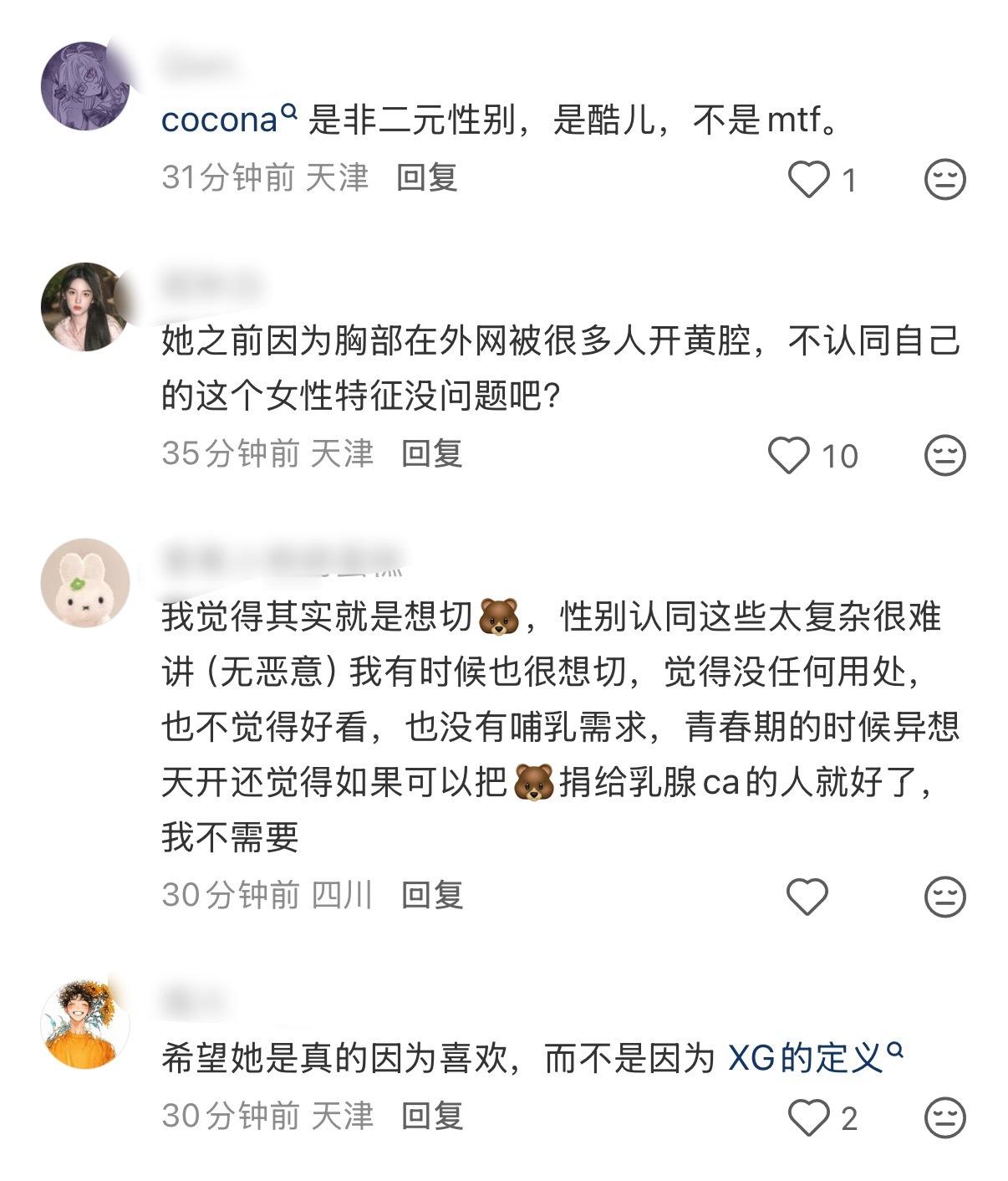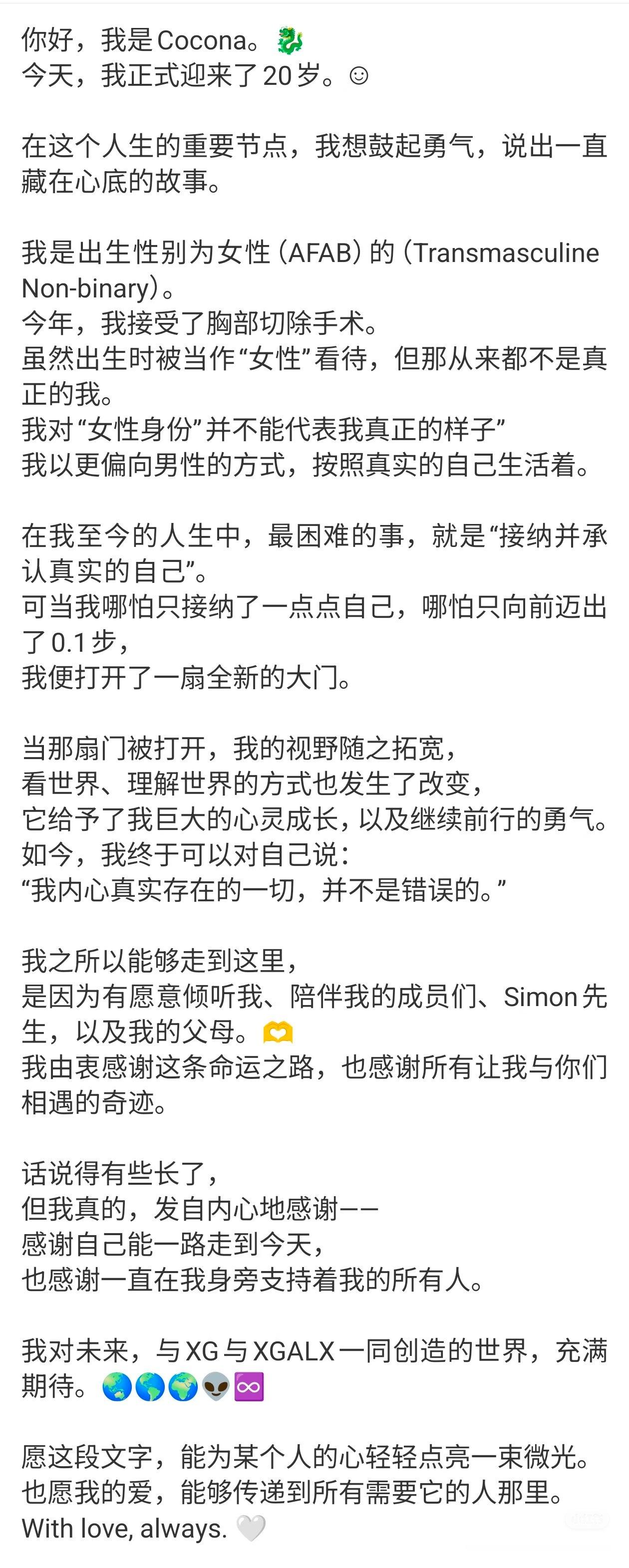 XG女团成员 cocona 秋山心響宣布胸部切除术天哪 不认同自己是女性 那还能在女团吗?而且为什么要切胸,男人也有胸啊……XG女团成员宣布胸部切除术 XG成员Cocona做胸部切除术