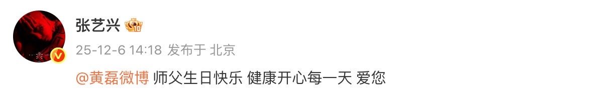 张艺兴给黄磊庆生张艺兴发文给黄磊庆生:“师父生日快乐 健康开心每一天 爱您”。