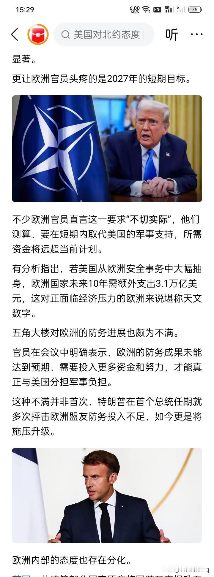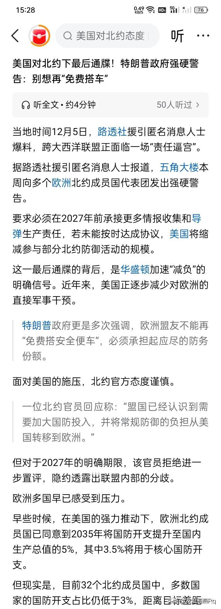不愿意做老大,请自便! 据说,美国国防部不久前向北约的很多成员国发出强硬要求,要求他们提高国防预算,国防预产占国民生产总值的比例应高于3%以上,并且最好达到5%。这样美国的武装力量就可以从欧洲的一些地区、甚至是很多地区撤回美国,减少美国自己的国防开支。也就是说,欧洲的北约国家,以后就不要再指望美国的武装力量保护他们,他们必须要自己保护自己。 自从俄罗斯对乌克兰发动的战争开始以后,实际上北约已经增加了很大的国防开支,并且似乎还在继续不断的增加国防预算。在这种情况下,美国不惜以好像彻底撕破脸的方式,打破以前很长时间的惯例,进一步的强硬要求他们增加国防预算,显然很不简单,美国似乎要将唯利是图发挥到极致。 长期以来,美国无疑是北约无可争议的老大。一般来说,在北约中获得老大的地位,一定会有利益的,但并不一定表现在表面上、或者明面上,而是馕括在国家的综合收益中,这些收益甚至是根本就无法明确区分。 现在,既然美国不愿意做北约的老大、或许还曾经是受人尊敬的老大,其实也没有什么大的问题,估计欧洲只好自己保护自己,本来北约的初衷就是对抗强大的前苏联集团,反正强大的前苏联集团早已经不复存在。 但是,从此之后,北约国家唯美国人马首是瞻,看美国人的脸色行事的时代,大概率也要彻底的成为过去了。