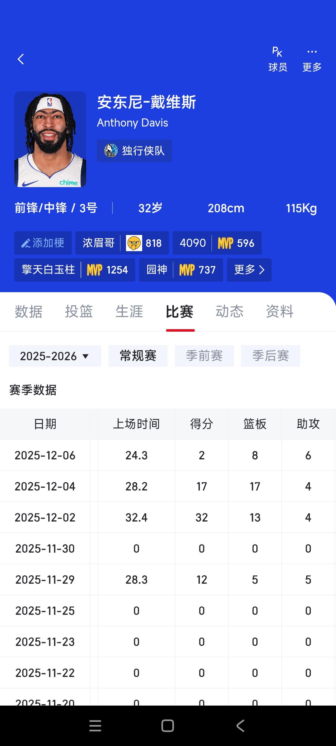 浓眉哥最近表现起伏太大,感觉恢复了,又感觉他快退役了。 复出第一场12分,还能接受。 复出第二场32的13篮板,牛的。 复出第三场17分17篮板,可以呀。 结果今天复出第四场,2分8篮板。 本赛季就打了9场比赛,都是首发,场均18分10篮板,如果没伤病其实还好。[可怜]