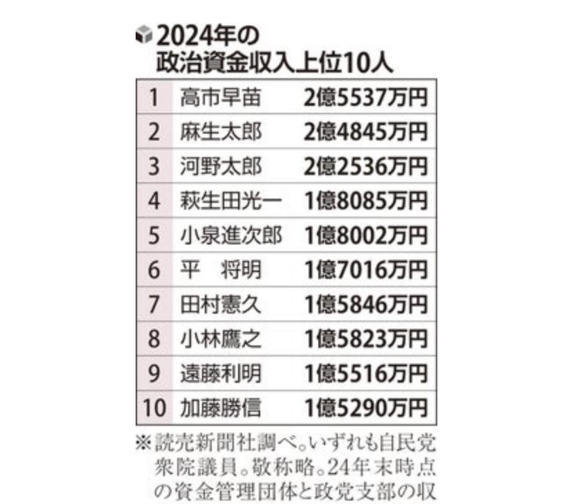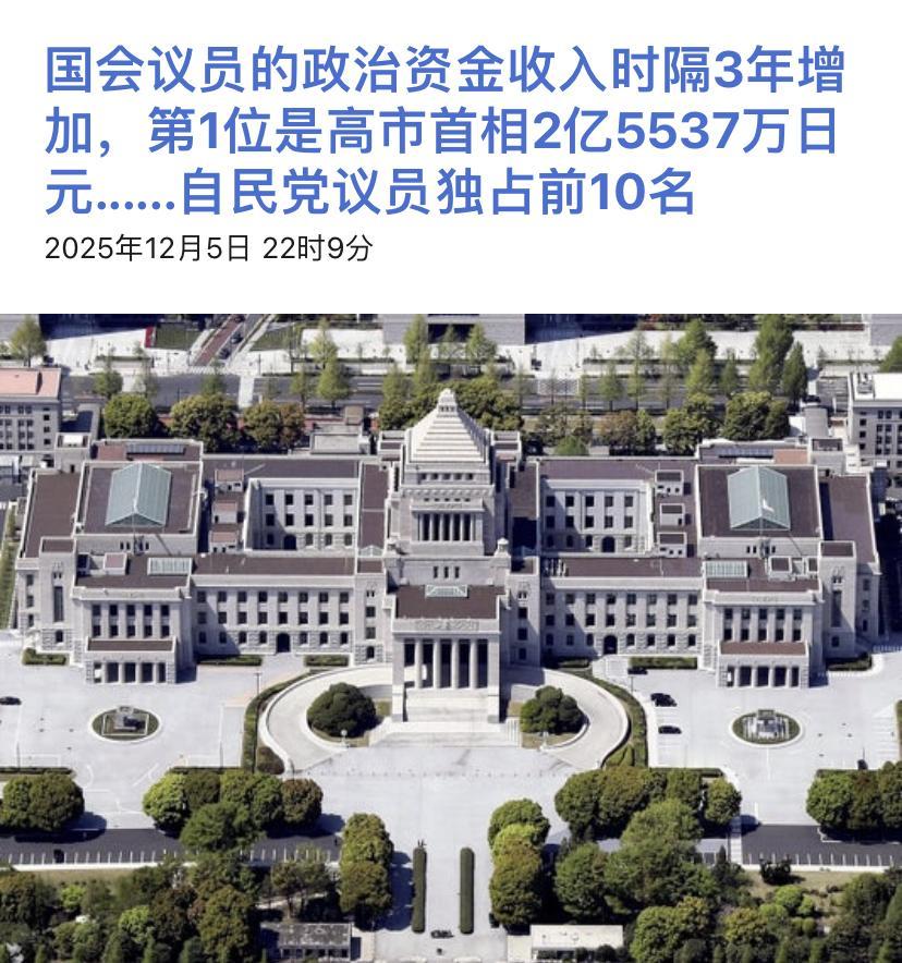 [呲牙]高市早苗最吸金 12月5日,日本公布了议员的政治资金收入。根据2024年政治资金收支报告书,比较日本各党党首当年的总收入,发现高市早苗(自民党总裁)以2亿5537万日元位居首位,比前一年的1亿日元大幅增长。 这说明在竞选中,高市早苗收到大量个人捐款,包括1.4017亿日元,与第2名的国民民主党代表玉木雄一郎相差4倍以上。 而且政治资金最高的前十名议员全都来自自民党。 不过,尽管高市早苗去年获得的政治资金最多,但她却不能用来花天酒地、买房置地,因为根据规定,这些钱要存入专门的基金会,除了涉及到选举和政治活动外,自己不能轻易动用。