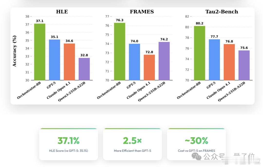 英伟达巧用8B模型秒掉GPT5 英伟达端着一个8B小模型对GPT-5说:不好意思,你还得练(bushi)。何出此言?——英伟达携手香港大学开源的Orchestrator-8B,人类终极考试HLE分数更高、花钱更少、跑起来速度还更快。哦对了,还在HuggingFace被狂赞,冲到了热门模型前五。而它超越GPT-5的打法是不当推理者,而是“工具主理人”,协调使用各路工具。网页链接