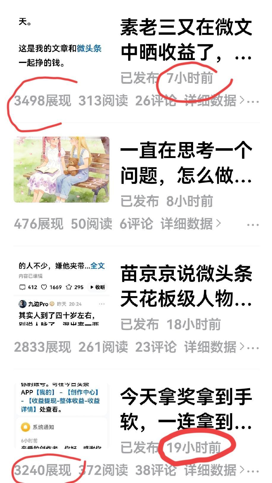 发觉一个流量密码,凡是有关苗京京与素老三的文章,流量要高一些,如果再加上晒他们的高收益,流量就更高一些。 昨天我的微文与今天的微文共四篇对比,昨天的两篇已经十八九个小时了,最高的3200的展现量,而关于素老三晒收益的文章就7个小时,展现量是3400、高于其他三篇微文的展现量。 原来流量不仅跟着网红跑,而且跟着高收益的配图跑,至于优不优质只有头条有解释权。