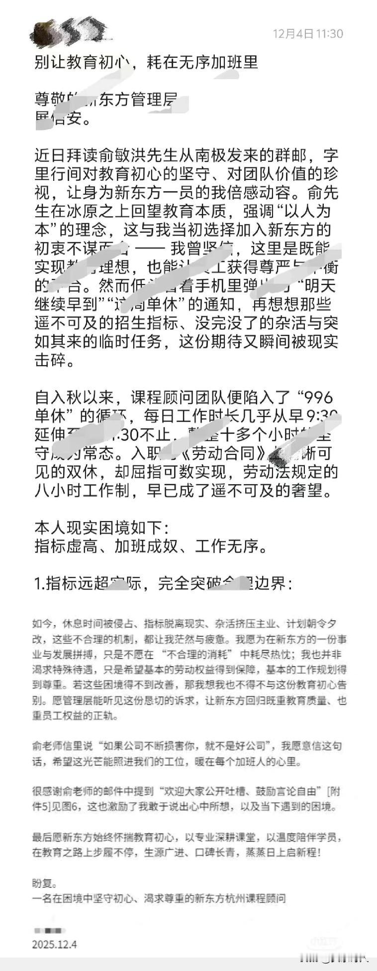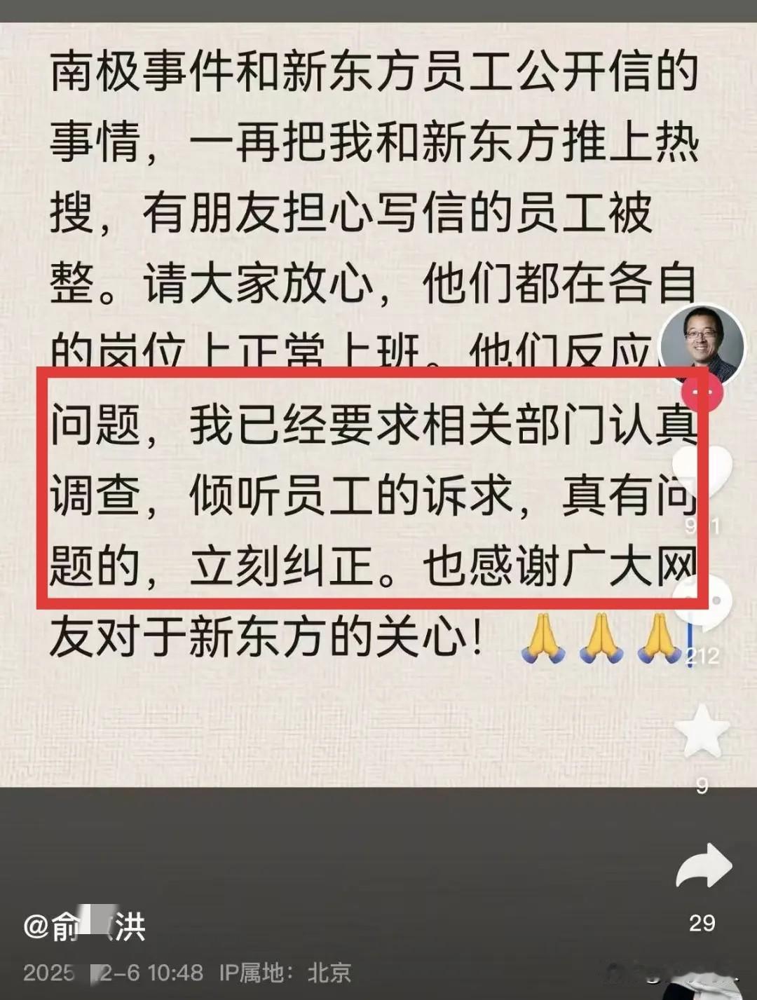 🔥俞敏洪,开始放大招了 最新回应【员工发长文控诉加班】→ “已经要求相关部门认真调查!” 这“相关部门”,是要利用官方的公信力来堵“吐槽的嘴”,还自己的清白吗? 俞总的回应中,还提到👉“倾听员工的诉求” 新东方这么大的公司,员工成千上万 众口难调,真的能听到“真心话”吗?? 倾听的是哪些员工的诉求? 是百万年薪的高层?是奋战一线的基层? 还是会提前安排名单,选择性去“倾听”呢? 相信俞总说的“相关部门” 一定会像俞总说的“认真调查”,倾听到“真的诉求” 俞总另外还说👉“如果真有问题的,立刻纠正。” 这一种知错、认错、改错的态度 有则改之,无则加勉 不得不说很有格局,很得分,难能可贵👍👍👍